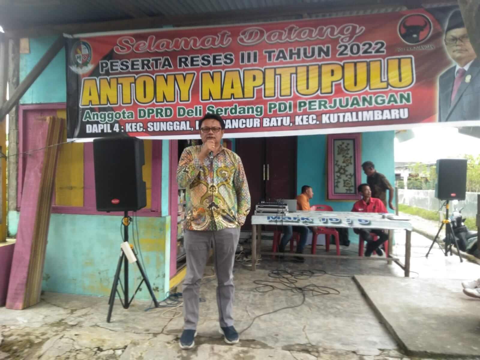 Anggota DPRD Kabupaten Deli Serdang dari fraksi PDI Perjuangan Antony Napitupulu menggelar Reses tahap III Tahun 2022, Di Jalan Tani Asli Dusun II Barat Desa Tanjung Gusta, Kecamatan Sunggal Deli Serdang, dihadiri puluhan masyarakat yang didominasi kaum Ibu Ibu. Kamis (29/09/2022) pukul 17.00 Wib.