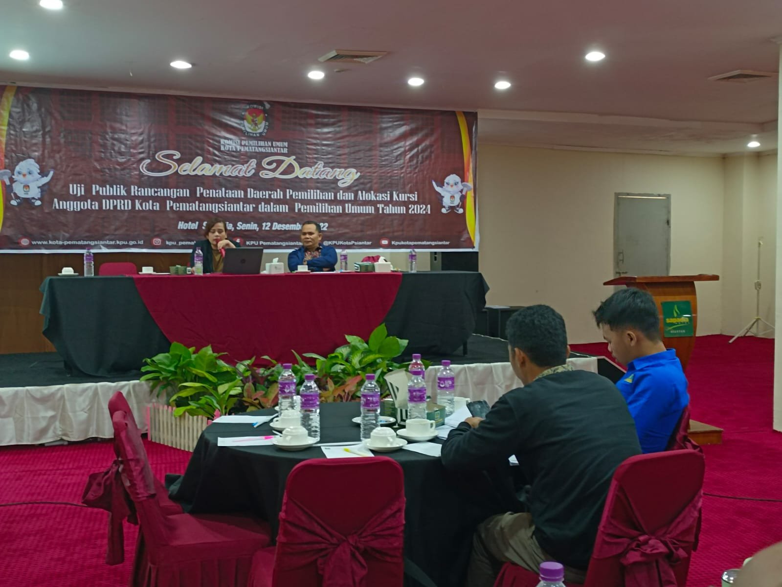 Komisi Pemilihan Umum (KPU) Kota Siantar gelar uji publik penataan daerah pemilihan (dapil) dan alokasi kursi DPRD Siantar untuk Pemilu 2024 mendatang di Hotel Sapadia Siantar.