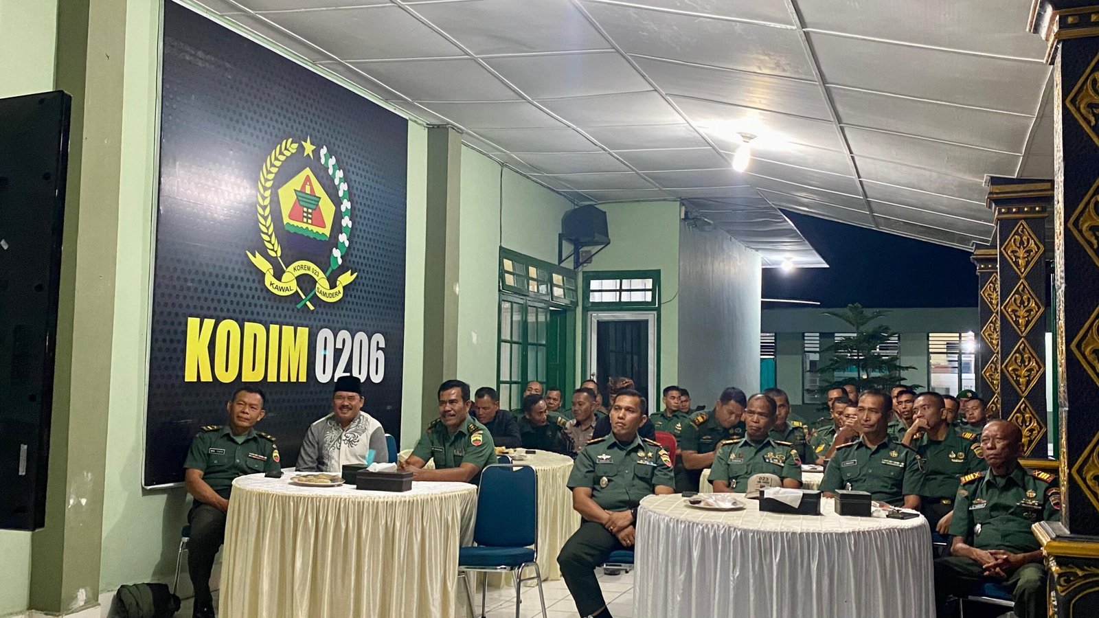 Dandim 0206/Dairi Letkol Inf Goklas Pirtahan Silaban bersama Perwira Penghubung, Jajaran Danramil dan Staf serta personil Kodim dan Tokoh Masyarakat melaksanakan nobar (Nonton bareng) live streaming penghargaan KASAD kampung Pancasila tahun 2023 dengan tema ” Kampung Pancasila sebagai wadah kebhinekaan dan toleransi” di serambi Makodim jalan Sisingamangaraja Sidikalang Kecamatan Sidikalang, kabupaten Dairi, Jum’at (8 Desember 2023) malam