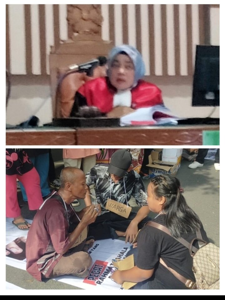 Ket.Gambar – Ketua Pengadilan Negeri Kota Tebingtinggi Cut Carnelia SH.MM ( Gambar  Atas ) dan Para Demontrasi Parodi dengan mempraktekan memakai Narkotika Jenis Sabu Di Depan kantor PN Kota Tebingtinggi Sumatera Utara.