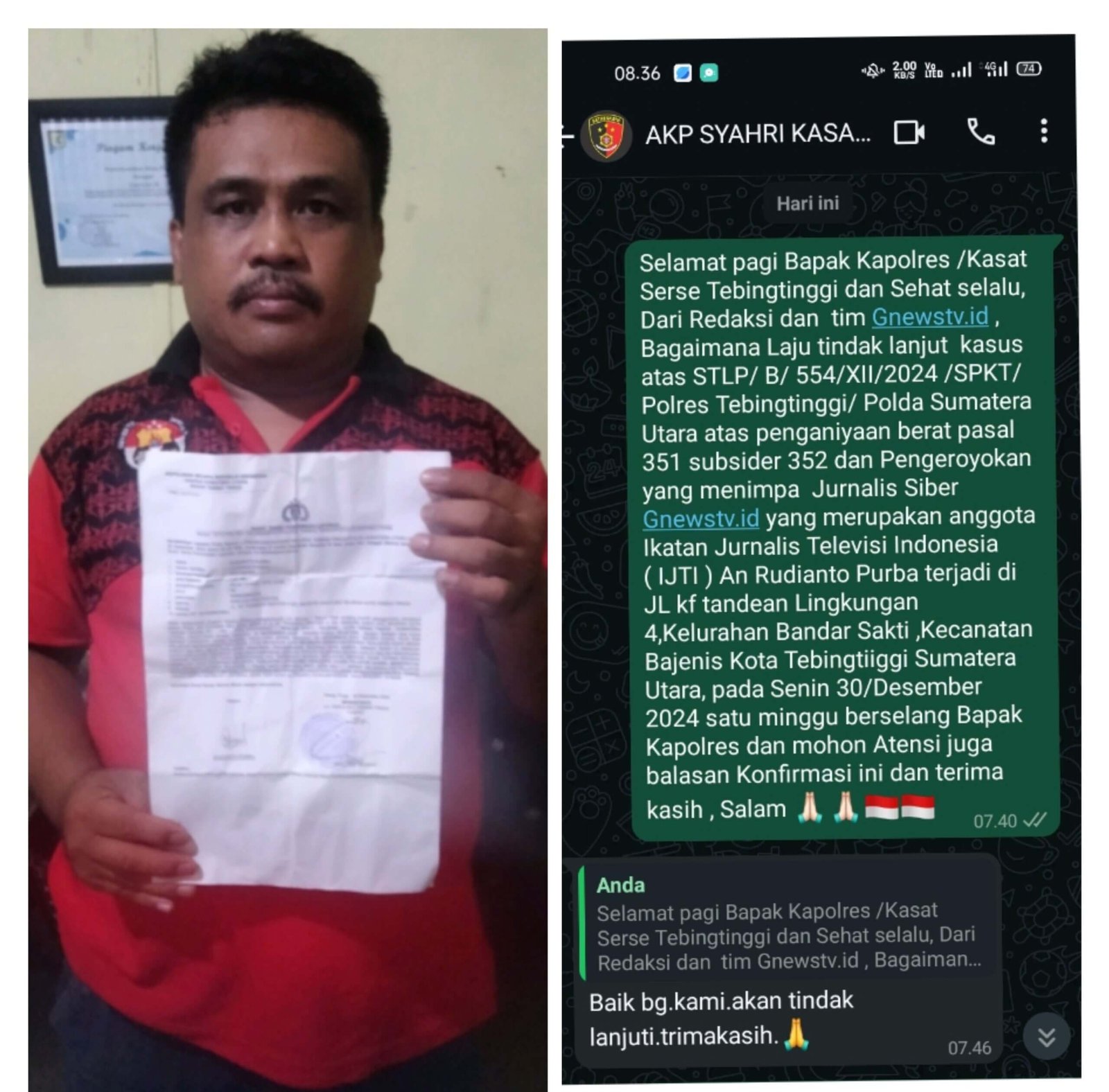 Sementara terkait hal ini tim Redaksi Gnewstv.id  pada Senin ini ,06 Januari 2025 ini, sekira pukul 07.40.Wib, kembali mengkonfirmasikan atas tindak lanjut Kasus Penganiyaan dan Pengeroyokan yang sempat Virall di media Itu dan di konfirmasikan Kepda Kapolres/ kasat Serse Polres Tebingtinggi, AKP. S Sebayang dan kasat menjawab dan mengatakan baik bang akan kita tindak lanjuti terima kasih dalam balasan WhatshApp miliknya.