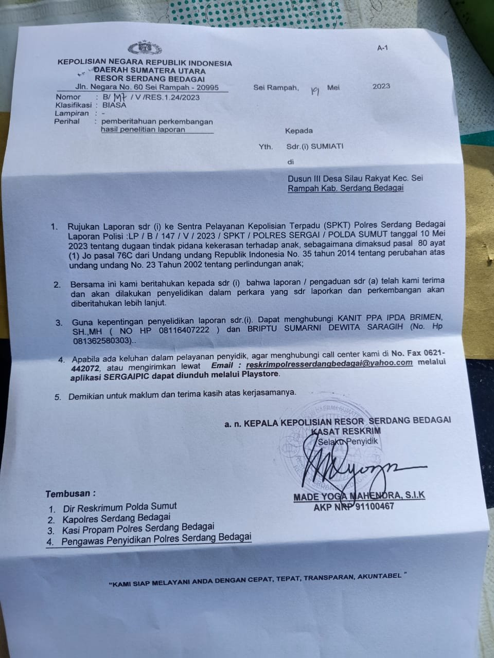 Ok.Hendri,SH juga menambahkan, bahwasanya Surat Pemberitahuan Perkembangan Hasil Penelitian Laporan (SP2HPL) yang diterima Pelapor dari pihak Unit PPA Satreksrim Polres Serdang Bedagai yang menyatakan bahwa terduga Penganiayaan MF yang dilakukan Oknum Kades MS diancam dengan Pasal 80 ayat (1) Junto Pasal 76C dari Undan-undang RI No.35 Tahun 2014 tentang Perubahan atas Undang-undang No.23 Tahun 2002 Tentang Perlindungan anak yang ancaman Hukumannya hanya 3,5 Tahun penjara dengan denda 72 Juta Rupiah dapat ditingkatkan dengan pasal 80 ayat (2) dengan ancaman Hukuman 5 Tahun penjara dengan denda 100 juta rupiah.