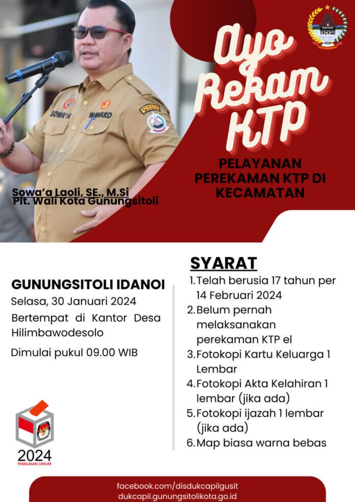 Kepala Dinas Kependudukan dan Pencatatan Sipil Kota Gunungsitoli menyampaikan bahwa perekaman KTP el ini dilaksanakan di tiap-tiap Kecamatan se-Kota Gunungsitoli dan sudah dijadwalkan sebelumnya, dan menghimbau agar seluruh masyarakat yang telah memenuhi syarat agar dapat memanfaatkan kesempatan ini.