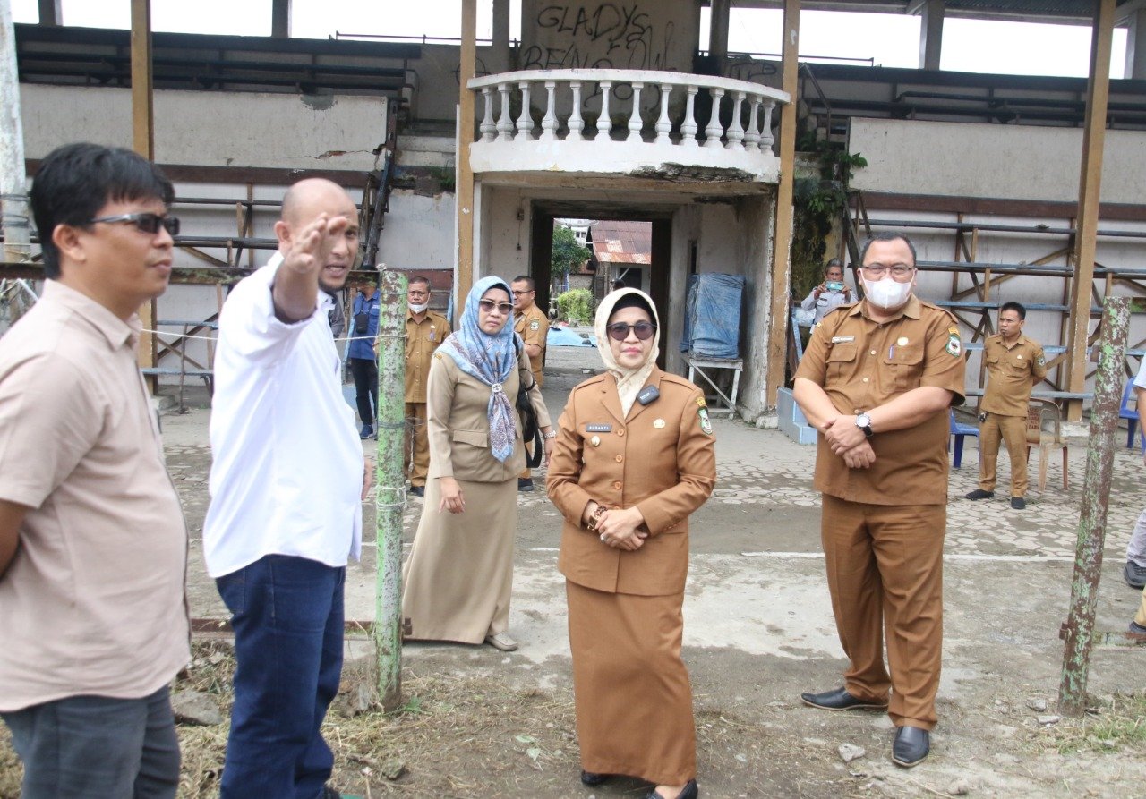 Wali Kota Pematang Siantar dr Susanti Dewayani SpA meninjau langsung progres revitalisasi Stadion Sangnawaluh di Kelurahan Sukadame Kecamatan Siantar Utara, Selasa (13/12/2022) sekitar pukul 11.00 WIB. Saat meninjau, dr Susanti bersama Plt Kepala Dinas Pekerjaan Umum dan Perumahan Rakyat (PUPR) Kota Pematang Siantar Deddy Tunasto Setiawan, perwakilan Dinas Pemuda dan Olahraga (Dispora) Pemerintah Provinsi Sumatera Utara (Pemprov Sumut) Andre, serta Konsultan Darwan Purba.
