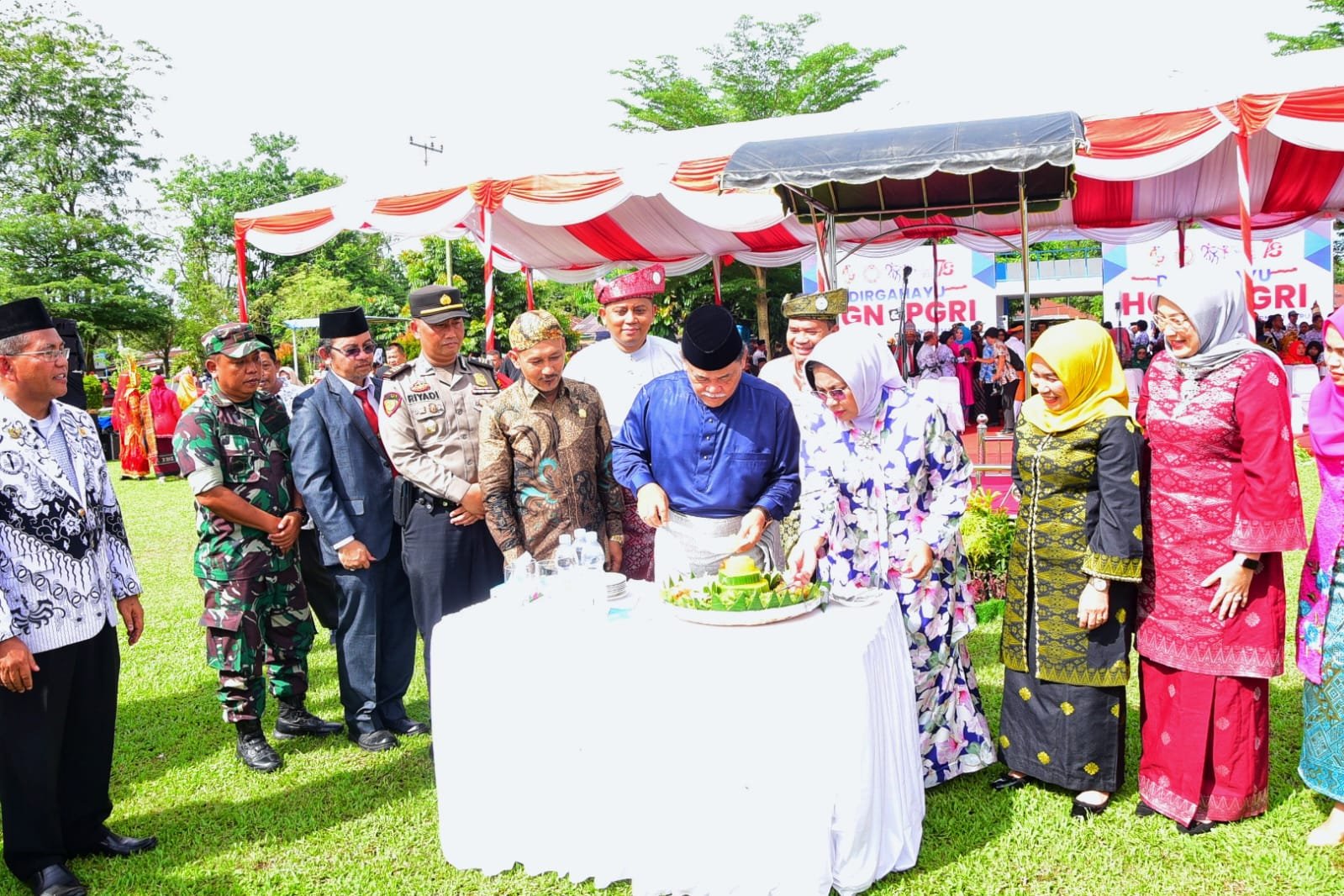 Pelaksana Tugas (Plt) Bupati Deli Serdang, HM Ali Yusuf Siregar yang menjadi Inspektur Upacara (Irup) tampak mengenakan pakaian khas Melayu. Sedangkan para peserta upacara juga memakai pakaian adat dan PGRI.