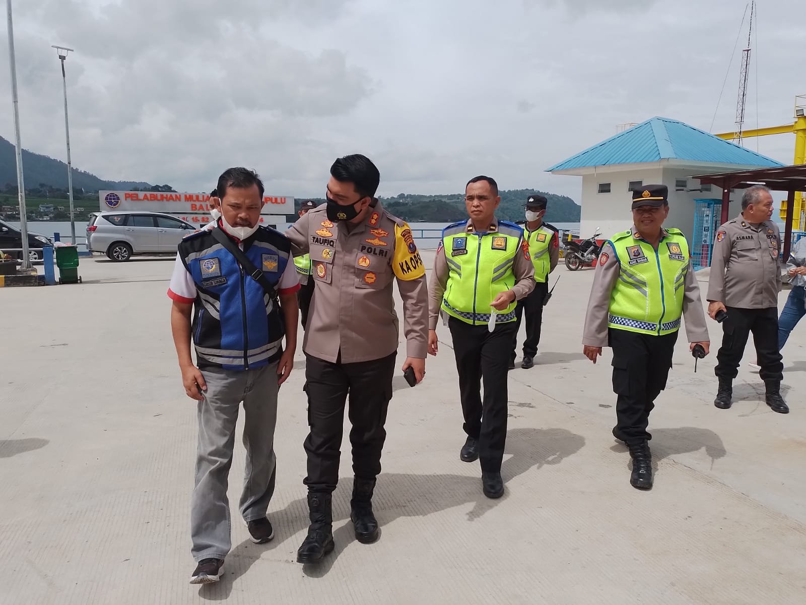 Hari Ketiga pelaksanaan kegiatan Ops Lilin Toba 2022. Kapolres Toba AKBP Taufiq Hidayat Thayeb, S.H., S.I.K., bersama romobongan Pamatwil Poldasu AKBP Fadris S.ik SH, dan Kompol T Simanjuntak melakukan peninjauan Pos Terpadu Pelabuhan Balige Jalan Bukit Barisan Balige Kabupaten Toba Sumatera Utara, Minggu (25/12/2022)