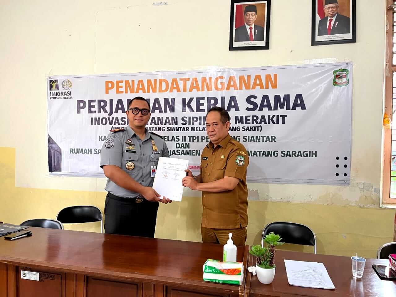 Imigrasi Kelas II TPI Pematang Siantar Kanwil Kemenhukumham Sumatera Utara, melaksanakan penandatanganan kerja sama inovasi layanan keimigrasian Sipintar Merakit (Imigrasi Pematangsiantar melayani orang sakit)dengan Rumah sakit Jasamen Saragih kota Pematangsiantar, Selasa (21/11) bertempat di RSUD Djasamen Saragih.