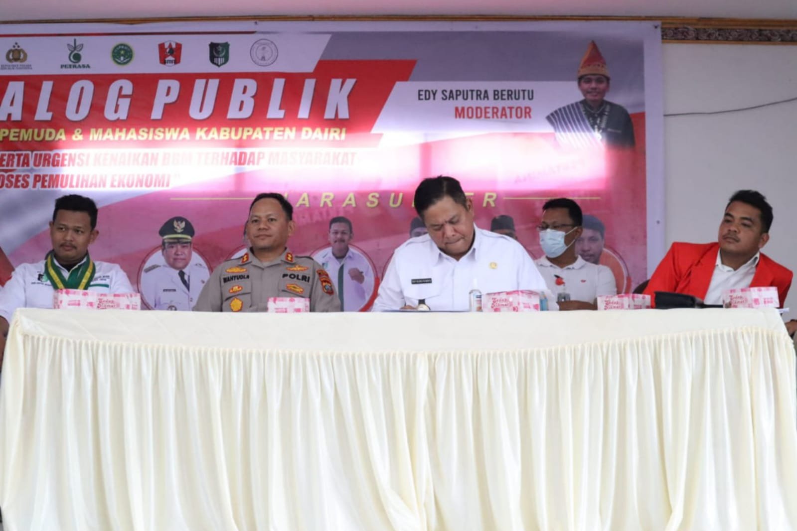 Kapolres Dairi Akbp Wahyudi Rahman, SH, SIK, MM bersama Forkopimda Kabupaten Dairi hadiri Dialog Publik dari Aliansi Pemuda dan Mahasiswa Kabupaten Dairi pada jumat siang 09/09/22 bertempat di Gedung Nasional Djauli Manik jalan Sisingamangaraja kecamatan sidikalang kabupaten Dairi.