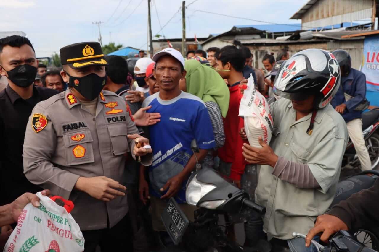Kapolres labuhan Belawan membagikan kepada Warga yang berada di TPI Gabion, Belawan antusias menerima bantuan beras dari Kapolda Sumut. Bantuan tersebut dibagikan langsung oleh Kapolres Pelabuhan Belawan AKBP Faisal Rahmat H.S., SIK., SH., MH.