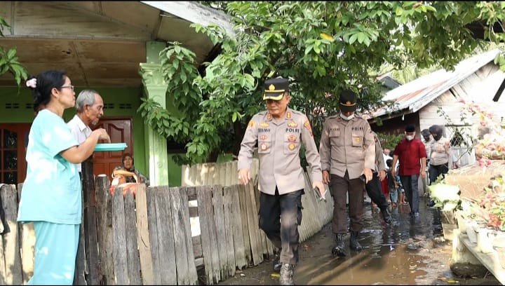 Kapolres Pelabuhan Belawan AKBP Faisal Rahmat H.S., SIK., SH., MH. Turun langsung membagikan bantuan sembako kepada warga yang terdampak banjir