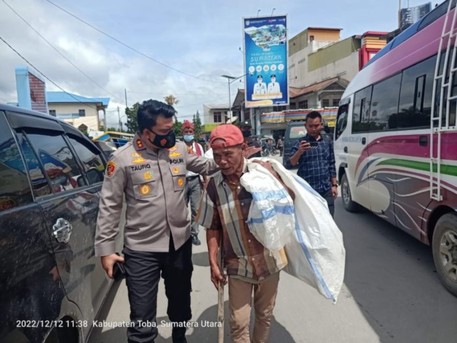 Disela sela kegiatan pengamanan Aksi Pawai Akhbar masyarakat yang tergabung PROTAP, Kapolres Toba AKBP Taufiq Hidayat Thayeb dengan berjalan kaki menyempatkan untuk menghampiri dan menyambangi serta menyapa abang becak di sekitar Bundaran Balige, Senin (12/12/2022)