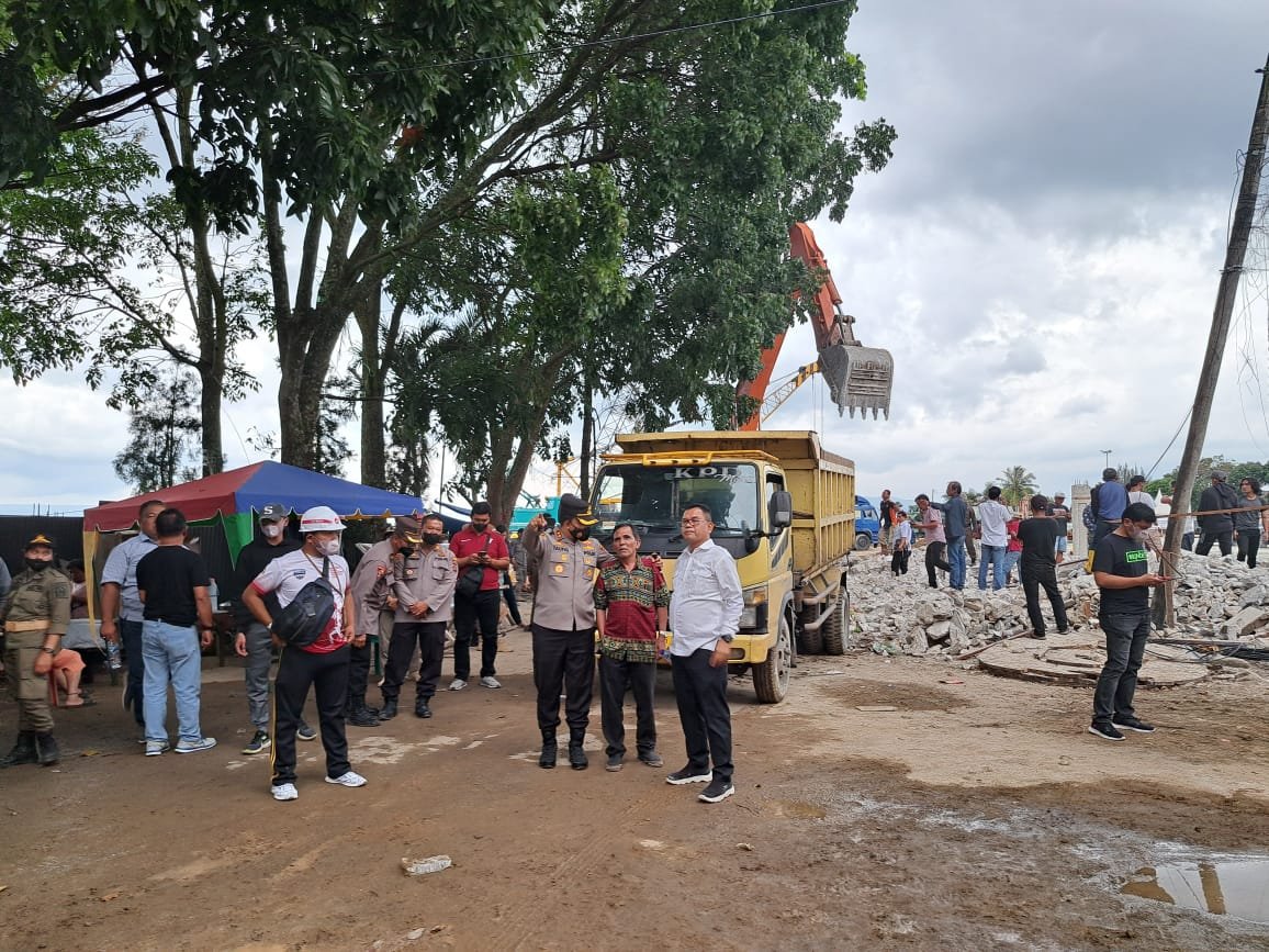 Kapolres Toba AKBP Taufiq Hidayat Thayeb bersama Forkopimda hadiri penertiban dan pengamanan 1 unit bangunan di lokasi F1H2O bertempat di Lapangan Sisingamangaraja Kelurahan Napitupulu Bagasan Kecamatan Balige Kabupaten Toba, Sumatera Utara, Sabtu (14/01/2023) sekira pukul 16.45 Wib.