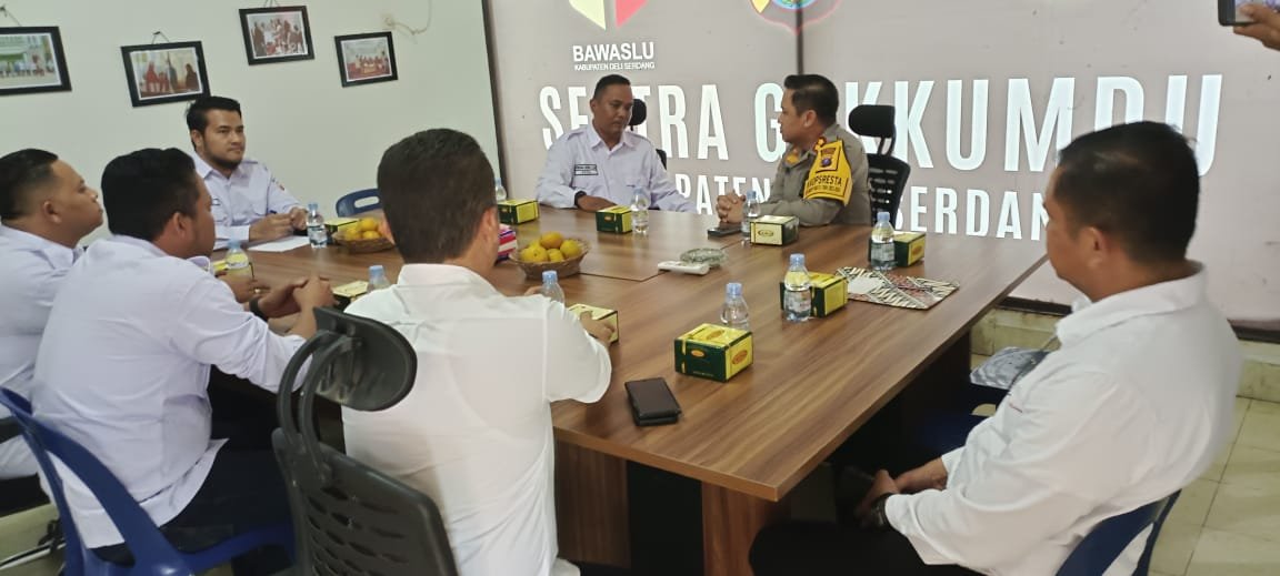 Kepada Ketua Bawaslu Kabupaten Deli Serdang Febriyandi Ginting S. M.Pd dan staff, Kapolresta Deli Serdang menyampaikan ” Polresta Deli Serdang akan bersinergi dengan BAWASLU dalam menghadapi tahapan Pemilu 2024 kedepannya ungkapnya.