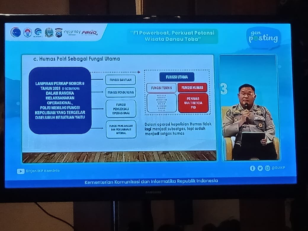 Kasubid Penmas Polda Sumatra Utara AKBP H. Herwansyah, dan Direktur Informasi dan Komunikasi Perekonomian dan Maritim Kemenkominfo Septriana Tangkary pada kegiatan Genposting: F1 Powerboat, Perkuat Potensi Wisata Danau Toba, serta SVP Marketing Communication & Tourism Program InJourney Retna Murti Asmoro yang bergabung melalui Zoom Meeting.