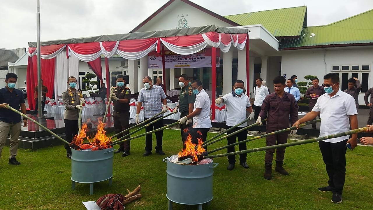 “Hal pemusnahan barang bukti hasil kejahatan ini kita lakukan setelah melalui hukum tetap (inkrahct) dan untuk pembuktian kepada masyarakat bahwa hukum harus ditegakkan bagi siapa pun yang melanggar nya,” jelas Kajari.