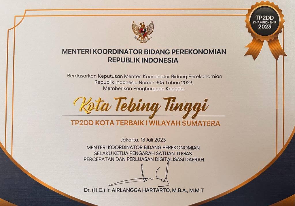 Kota Tebing Tinggi kembali menerima penghargaan yang cukup prestisius (membanggakan) untuk kedua kalinya sejak tahun 2022, yakni penghargaan TP2DD (Tim Percepatan dan Perluasan Digitalisasi Daerah) Kota Terbaik I Wilayah Sumatera dari Menteri Koordinator Bidang Perekonomian selaku Ketua Pengarah Satuan Tugas Percepatan dan Perluasan Digitalisasi Daerah Dr.(H.C.) Ir. Airlangga Hartarto, M.B.A., M.M.T., Selasa (3/10/2023) bertempat di Grand Sahid Jaya Jln. Jend. Sudirman, Jakarta.