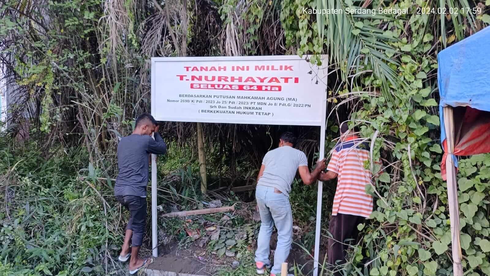Saat berada di Lokasi Objek Perkara, tampak Tulisan yang tertera di plang tersebut berisikan “Tanah Ini Milik T.Nurhayati Seluas 64 Ha Berdasarkan Putusan Mahkamah Agung (MA) Nomor 2690/ K/Pdt/2023 Jo 25/Pdt/2023/PT MDN Jo 8/ Pdt.G/2022/PN Srh dan Sudah Inkrah (Berkekuatan Hukum Tetap)”.
