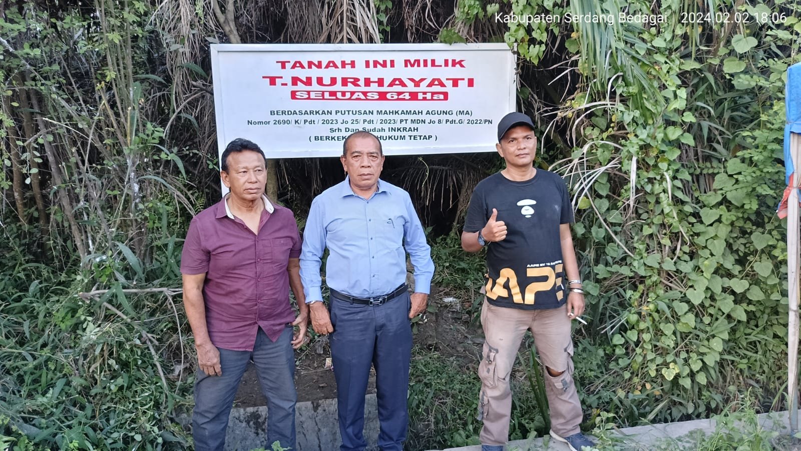 Saat berada di Lokasi Objek Perkara, tampak Tulisan yang tertera di plang tersebut berisikan “Tanah Ini Milik T.Nurhayati Seluas 64 Ha Berdasarkan Putusan Mahkamah Agung (MA) Nomor 2690/ K/Pdt/2023 Jo 25/Pdt/2023/PT MDN Jo 8/ Pdt.G/2022/PN Srh dan Sudah Inkrah (Berkekuatan Hukum Tetap)”.