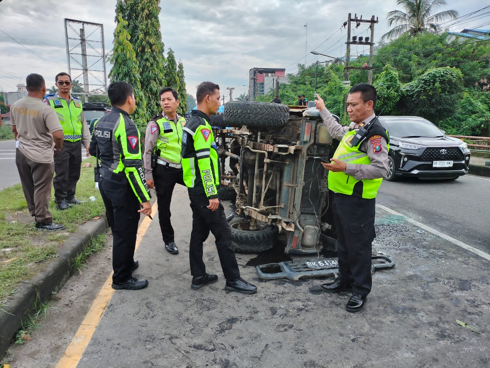 DELI SERDANG : Mobil penumpang KBT jenis toyota Hiace bertulis Bintang Tapanuli Plat BB 7248 BB hantam belakang mobil pick up jenis Daihatsu Hiline BK 8114 DS hingga terguling, 6 Penumpang di Larikan ke rumah sakit.