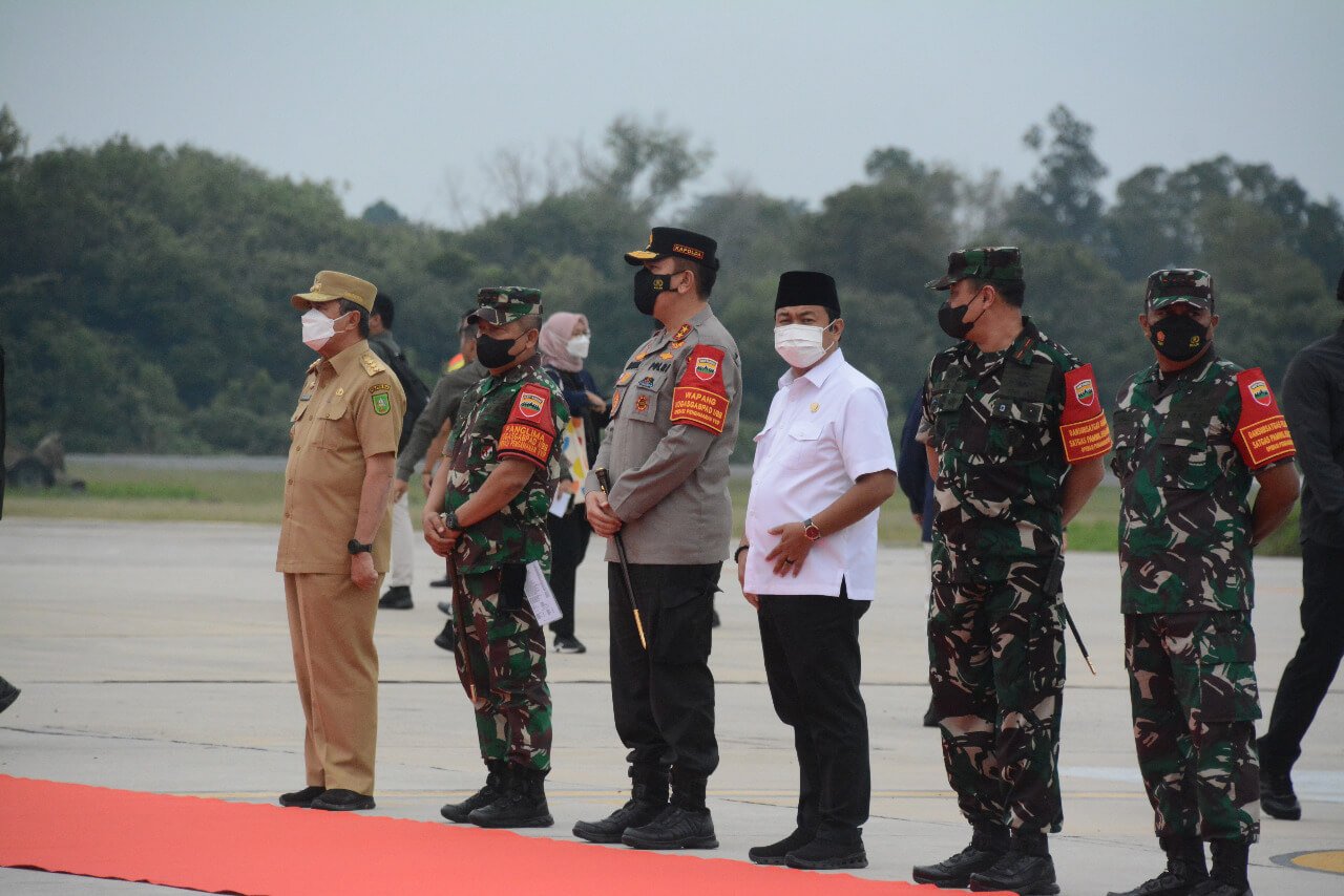 Pangdam I/BB, Mayjen TNI Achmad Daniel Chardin, SE, MSi, bersama unsur Forkopimda Riau menyambut kedatangan Presiden RI, Joko Widodo didampingi Ibu Iriana Joko Widodo dan sejumlah menteri kabinet di Bandara Sutan Syarif Kasim, Pekanbaru, Riau, Rabu (4/1/2023).