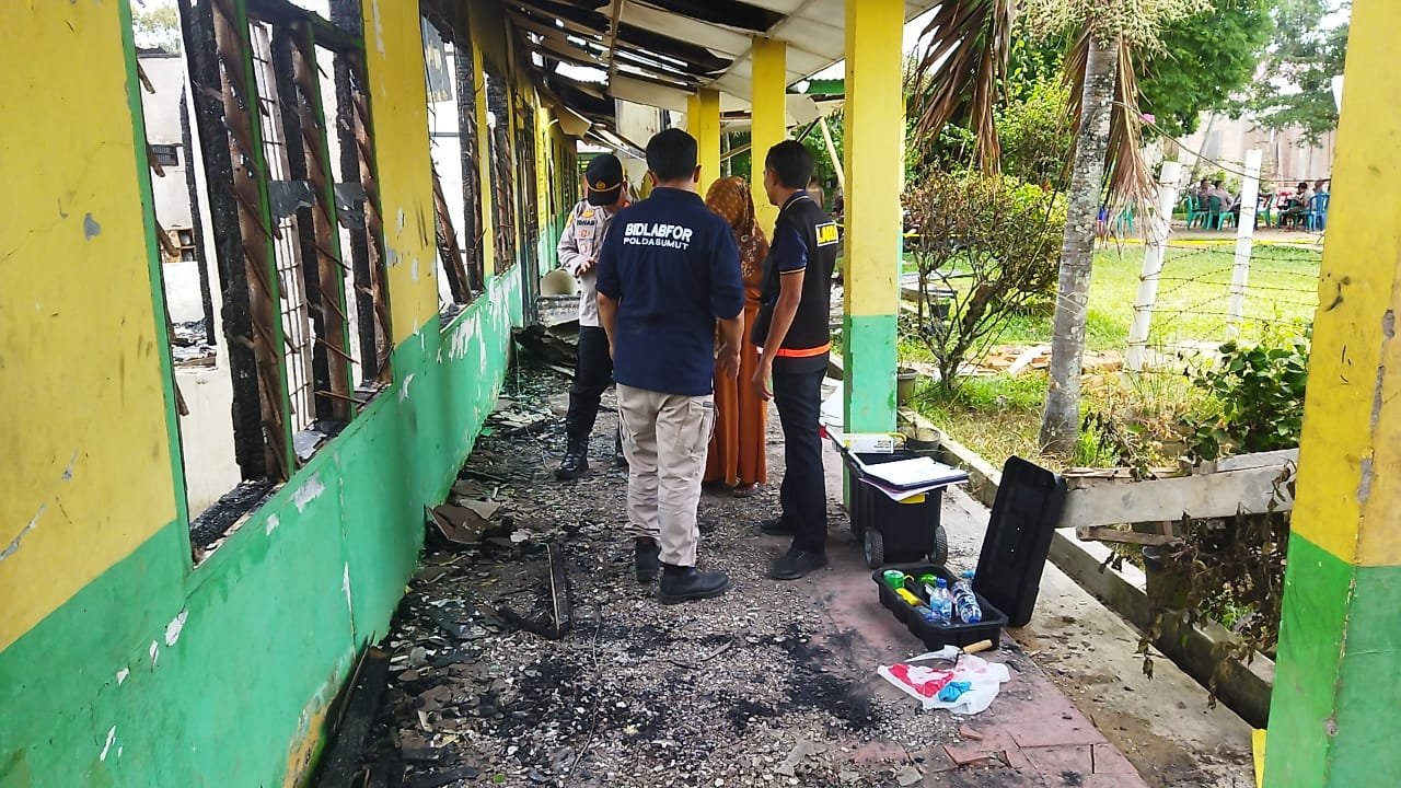 Kebakaran yang menghanguskan gedung sekolah Perguruan Al-washliyah Desa Simpang Empat Kecamatan Sei Rampah Kab. Serdang Bedagai pada hari Sabtu, 15/7/2023 yang lalu, Tim Labfor Polda Sumut lakukan penyelidikan awal dan olah Tempat Kejadian Perkara (TKP) penyebab kebakaran.