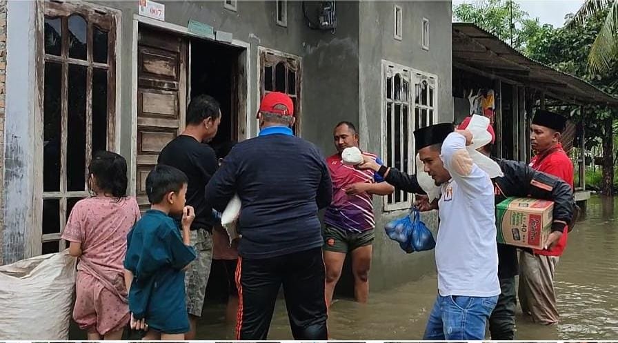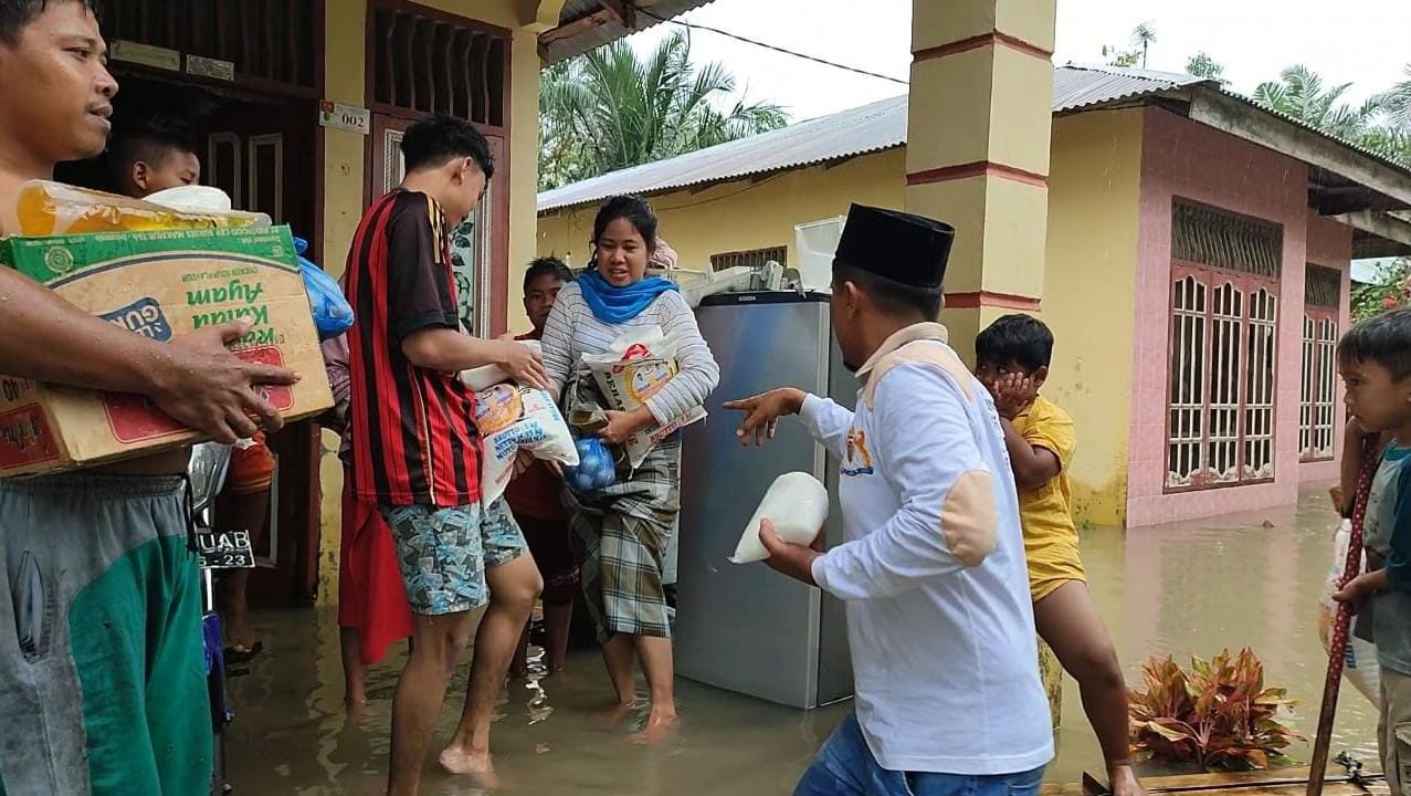 Peduli terhadap korban banjir, relawan OK Faizal berbagi sembako di Desa Empat Negeri dan Kuala Gunung, Kecamatan Datuk Limapuluh, Kabupaten Batu Bara.