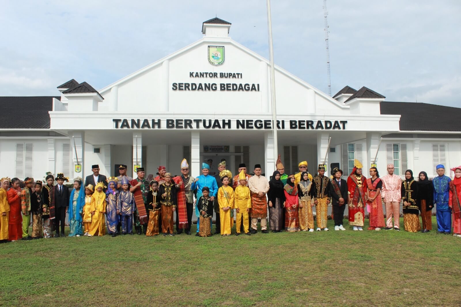 Dengan mengenakan pakaian adat daerah, jajaran Pemerintah Kabupaten Serdang Bedagai (Sergai) menggelar upacara dalam rangka memperingati Hari Pendidikan Nasional (Hardiknas) yang dilaksanakan di Halaman Kantor Bupati Sergai, Sei Rampah, Selasa (2/5/2023) pagi.