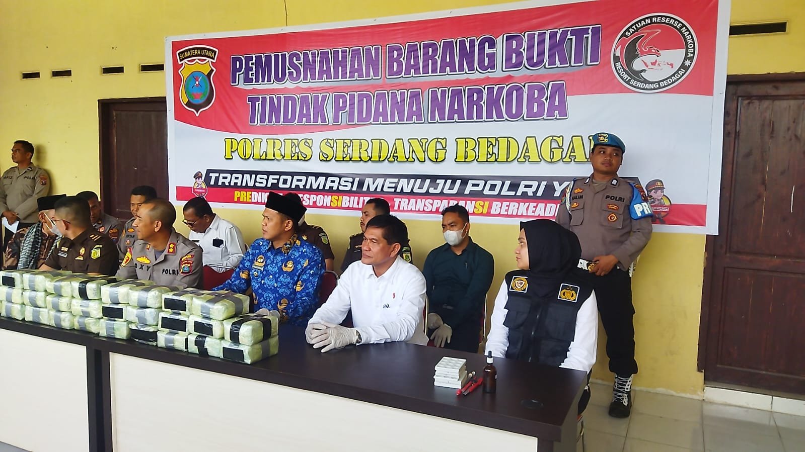 Kepolisian Republik Indonesia oleh Poldasu dan Polres Sergai melakukan pemusnahan barang bukti narkotika golongan I jenis shabu-shabu di halaman Mapolres Serdang Bedagai Senin, (22/5/2023) Pukul 11.30 Wib yang dilakukan langsung oleh AKBP Oxy Kapolres Serdang Bedagai dan di dampingi oleh Wakil Bupati Serdang Bedagai, Direktorat Narkoba Poldasu, Labfor Poldasu, Kejaksaan Negeri Serdang Bedagai serta Tokoh Agama dengan cara pemusnahan di rebus dengan air mendidih dan air nya dibuang ke toilet.