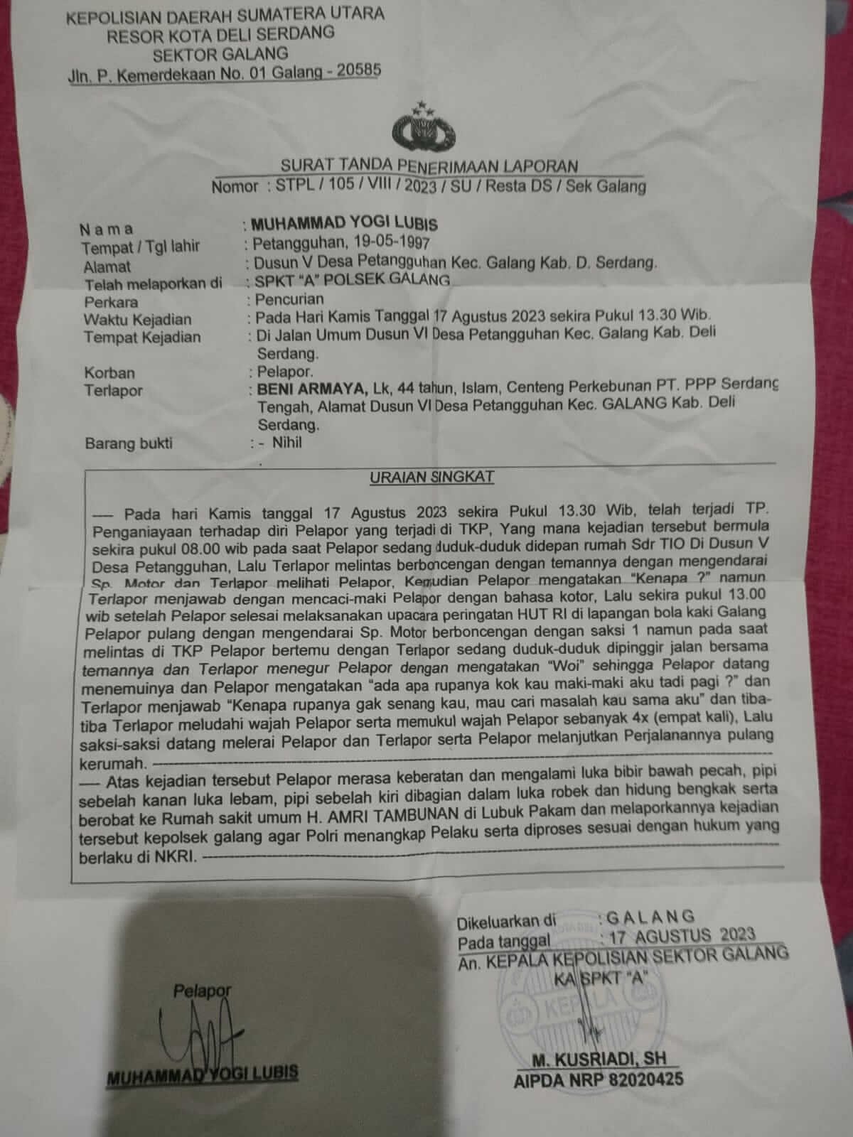 Merasa tidak terima terhadap penganiayaan tersebut, Muhammad Yogi Lubis dengan bibir pecah lantas mendatangi Polsek Galang guna melaporkan peristiwa yang baru saja dialami oleh nya.