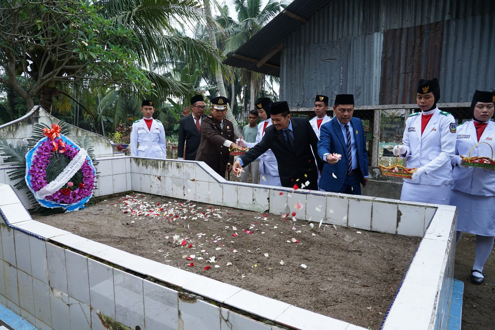 Titik lokasi di Taman Makam Bahagia dan Jembatan Titi Gantung, Kajari Muhammad Muchsin, S.H., M.H.  selaku Inspektur Upacara, memimpin rangkaian upacara yang berlangsung khidmat, mulai dari penghormatan kepada arwah para pahlawan, mengheningkan cipta, peletakan karangan bunga dan penaburan bunga.