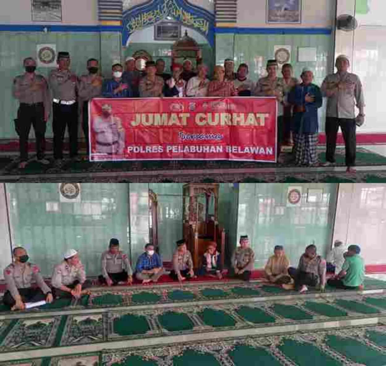 Personil Polres Pelabuhan Belawan melaksanakan kegiatan Jumat Curhat kepada jamaah Masjid Nurul Yaqin bertempat di Komplek PJKA Belawan Wilkum Polres Pelabuhan Belawan, pada Jumat (2/12/2022) sekira pukul 12.30 Wib hingga selesai.