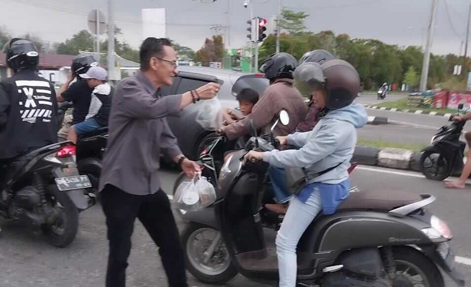 Kantor Berita Online (KBO) Bangka Belitung dan Pemerhati Jurnalis Siber (PJS) Babel berbagi takjil kepada pengendara yang melintas di kawasan perempatan lampu merah Air Hitam, Kota Pangkalpinang.Jum’at (14/04/2023).