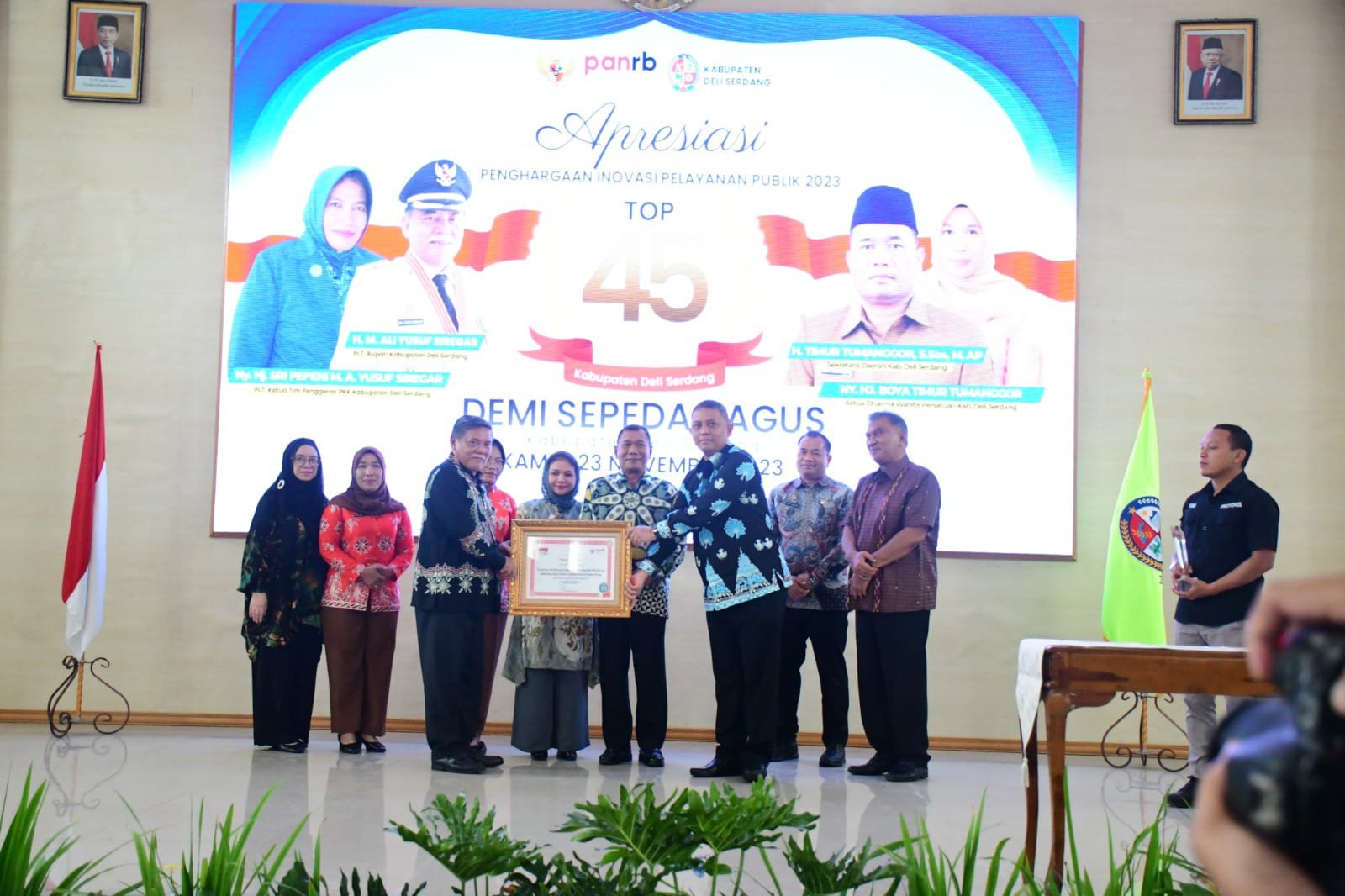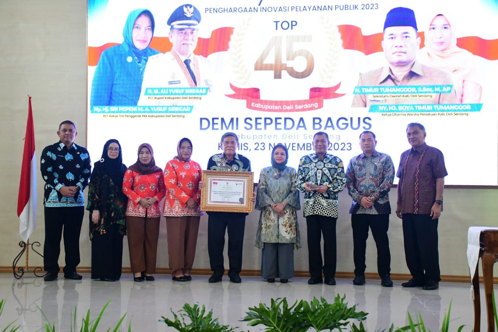 “Deli Serdang itu adalah kabupaten hebat. Ini kita membuktikannya dengan meraih Penghargaan Top 45 Pelayanan Publik dari Kementerian Pendayagunaan Aparatur Negara dan Reformasi Birokrasi (Kemenpan-RB) dengan Judul Inovasi, “Demi Sepeda Bagus yang merupakan akronim dari Deli Serdang Mewujudkan Impian Sekolah Keluarga dan Anak Berkebutuhan Khusus. Kita juga patut berbangga dan berbesar hati karena ini adalah keenam kalinya Kabupaten Deli Serdang mendapatkan penghargaan yang paling bergengsi dalam rangka Inovasi Pelayanan Publik,” ungkap Plt Bupati.