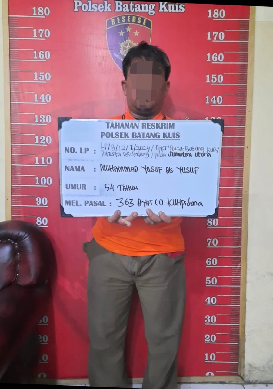 Polsek Batang Kuis Polresta Deli Serdang Berhasil amankan satu orang pelaku berinisial MY (55) warga Jl.Wira Bakti Dusun IX Desa Tanjung Sari Kec.Batang Kuis Kab.Deli Serdang terkait tindak pidana pencurian dengan pemberatan. Senin (22/01/2024).