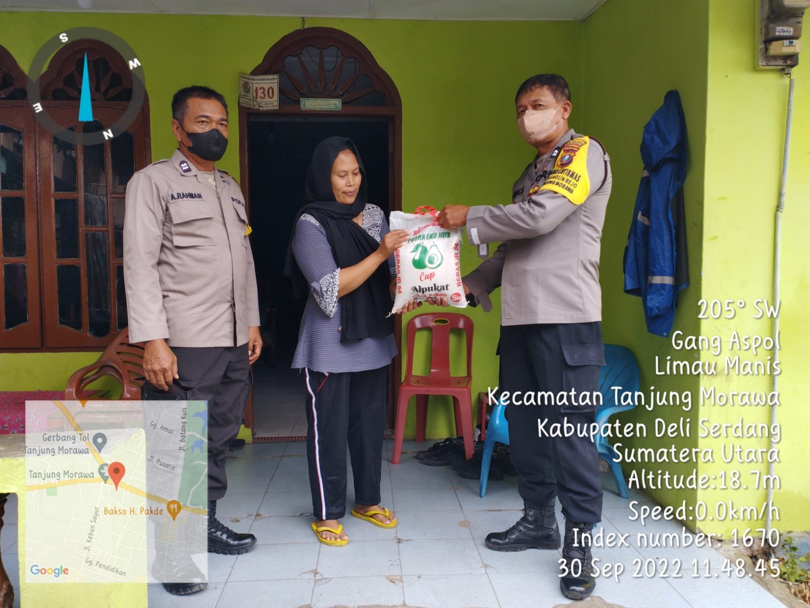 Polsek Tanjung Morawa Polresta Deli Serdang bagikan bantuan sosial (bansos) kepada masyarakat, dalam upaya meringankan beban masyarakat pasca kenaikan harga BBM, Jumat (30/09/2022).