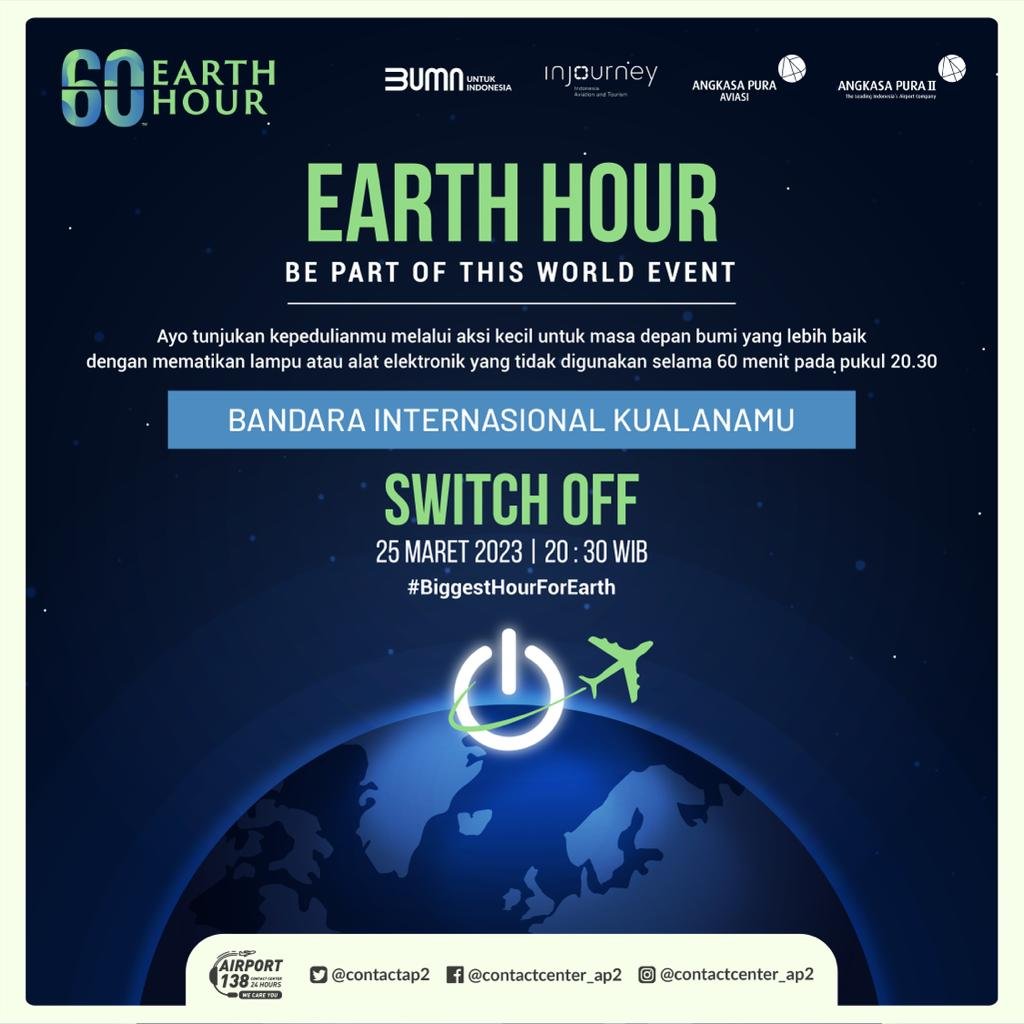 Kegiatan Earth Hour adalah kampanye global WWF yaitu konservasi terbesar di dunia. Bertujuan mengajak individu, komunitas, praktisi bisnis, dan pemerintahan di seluruh dunia untuk menyatakan kepedulian di seluruh dunia , terhadap iklim dengan cara mematikan lampu dan peralatan elektronik. Kegiatan ini akan berlangsung pada Hari Sabtu di minggu terakhir bulan Maret setiap tahunnya, Untuk Bandara Kualanamu sendiri pemadaman akan berlangsung selama 30 Menit. Untuk Area yang dipadamkan adalah Office, Drop zone, Check-in Counter, Shoping Area, Food Court, Boarding Lounge, Parking Area, Office area, dll.