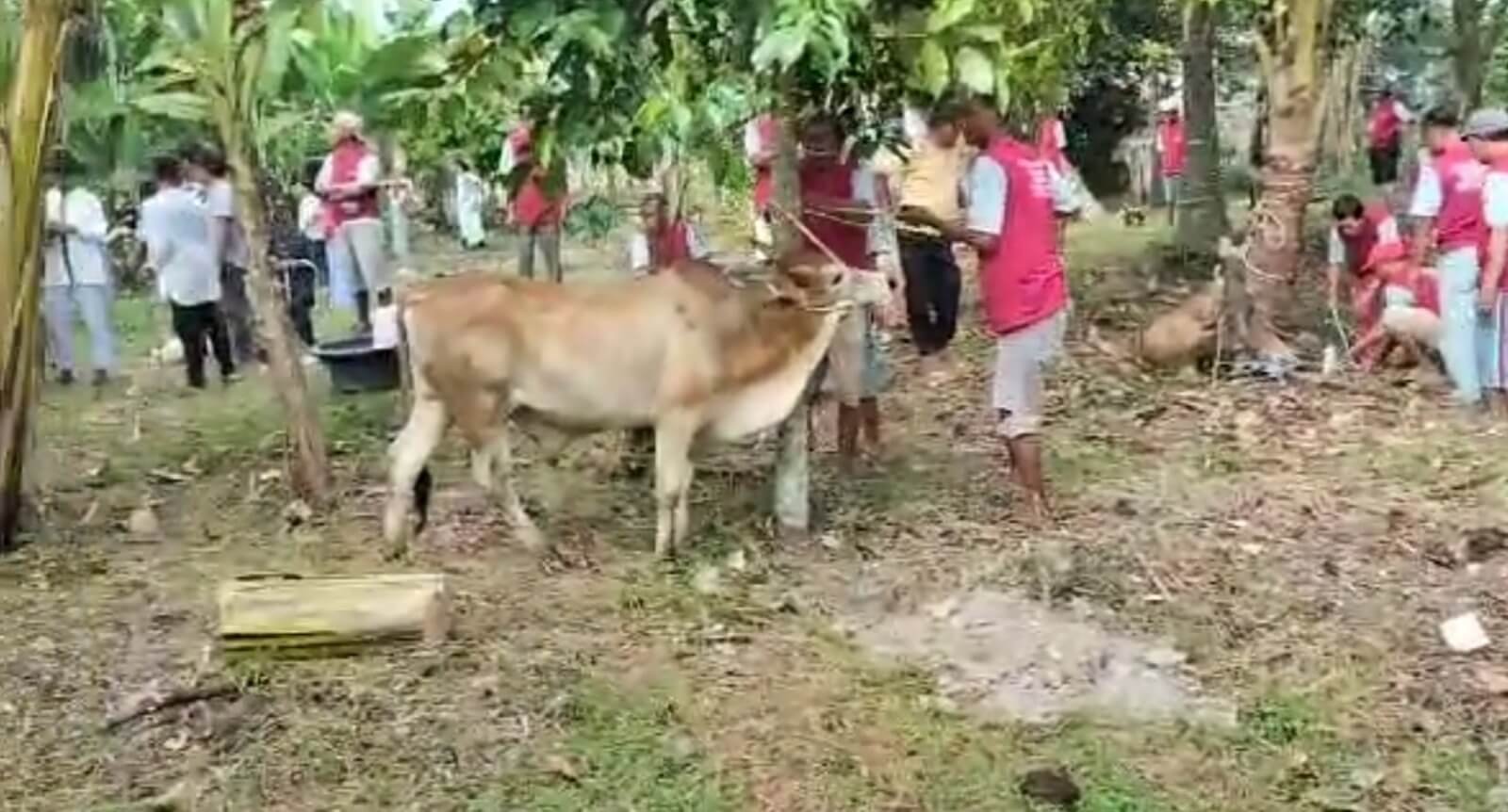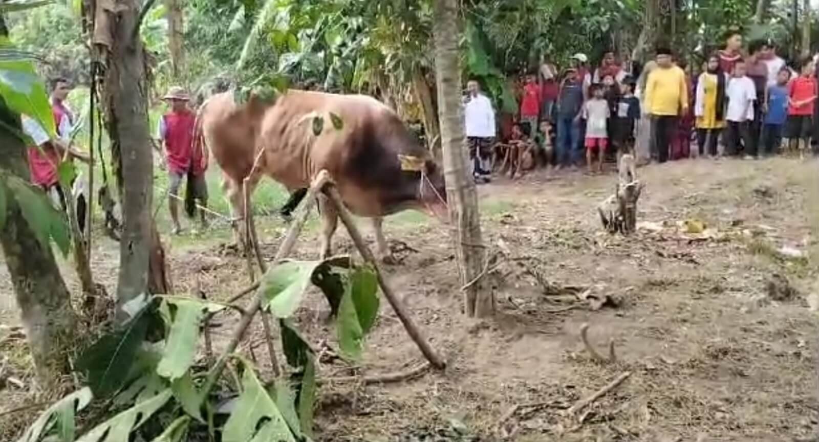 Deli Serdang : Dalam momen Hari Raya Idul Adha 1444 Hijriah/ 2023 Masehi, dusun Sadar Timur yang merupakan satu dari 16 Dusun di Desa Sekip, Kecamatan Lubuk Pakam, Kabupaten Deli Serdang menyembelih hrwan kurban sebanyak 13 ekor sapid an 6 ekor kambing, dimana dari 13 ekor sapi tersebut 4 diantaranya merupakan sapi kurban dari warga Dusun Sadar Timur yang merupakan seorang pengusaha sedangkan 9 ekor sapi lagi merupakan kurban warga Dusun Sadar Timur yang menambung uangnnya selama satu tahun.