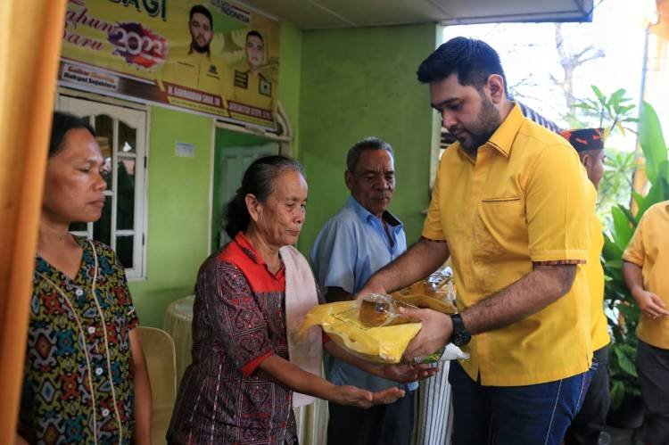 Ketua Partai Golkar Kota Medan M Rahmaddian Shah memberikan bantuan paket sembako kepada warga kurang mampu dalam rangka merayakan Natal 2022 dan Tahun Baru 2023 (Nataru).