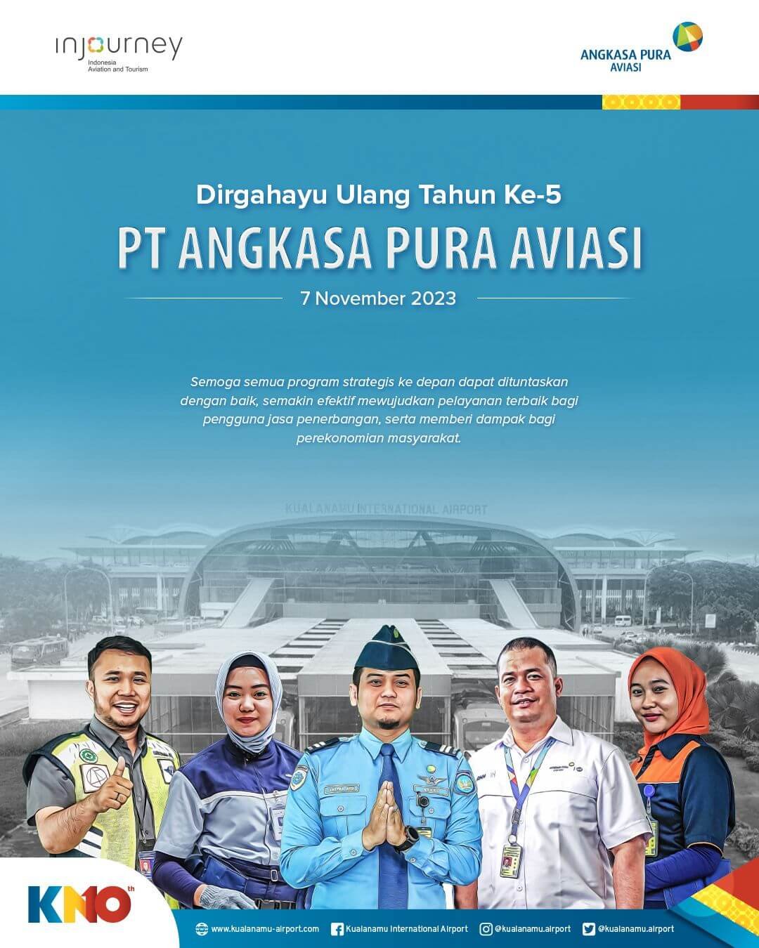 07 November 2023. PT Angkasa Pura Aviasi sebagai Pengelola Bandara Internasional Kualanamu saat ini sedang berusaha mewujudkan Bandara Internasional Kualanamu sebagai Hub (Bandara Utama) and Spoke (Bandara Pengumpan) Indonesia Bagian Barat, dengan berkolaborasi bersama Pemerintah Pusat maupun Pemerintah Daerah, Mitra Kerja dan Mitra Usaha serta Stakeholder lainnya di Bandara, guna meningkatkan jumlah Penerbangan dan mengundang Maskapai baru baik Internasional maupun Domestik untuk membuka rute-rute baru dari dan ke Bandara Kualanamu serta melakukan pengembangan sarana, prasarana dan fasilitas Bandara, guna meningkatkan kepuasan Pengguna Jasa dan Stakeholder Bandara Internasional Kualanamu.