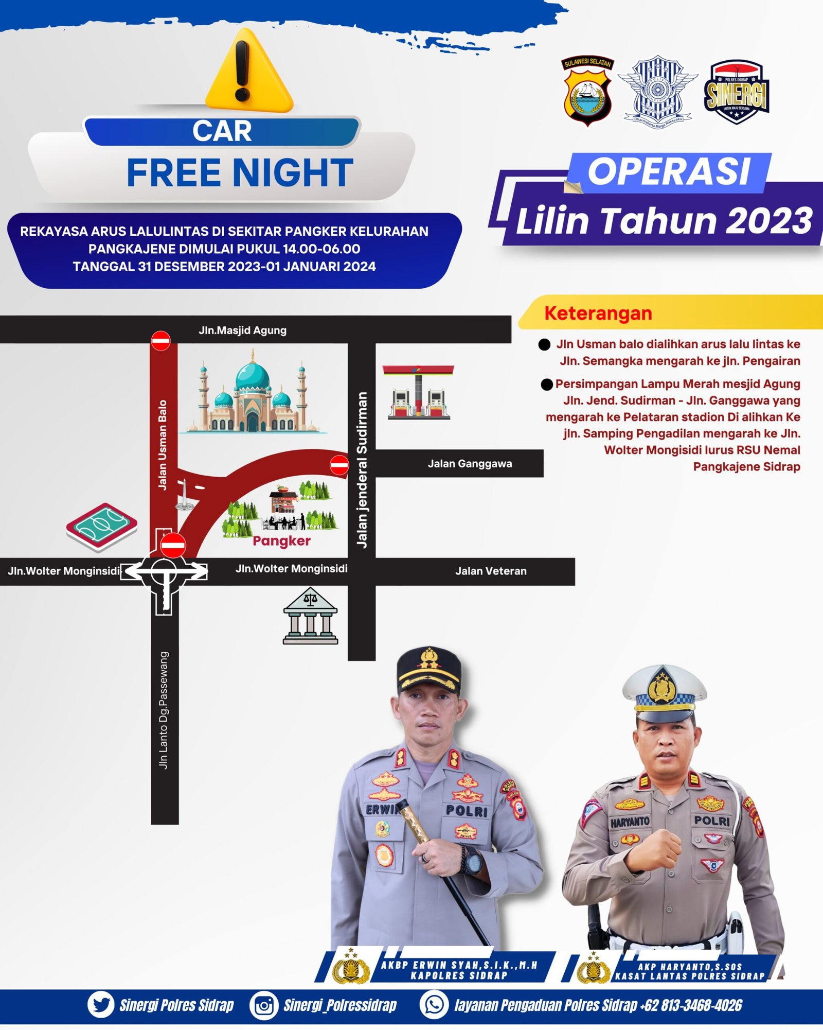 Menurut Kapolres Sidrap melalui Kasat Lantas bahwa, Sat lantas Polres Sidrap akan mengalihkan jalur arus lalu lintas di Dalam Kota Kabupaten Sidrap terkhusus di sekitaran plataran stadion Ganggawa Sidrap atau Pengker.