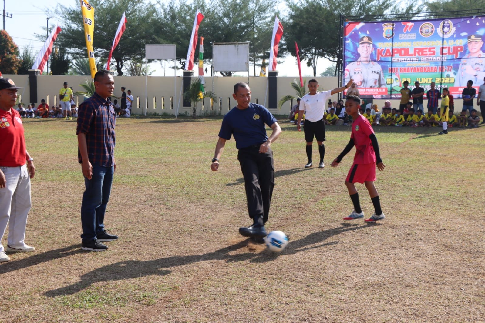 Kapolres Serdang Bedagai AKBP Oxy Yudha Pratesta didampingi Ketua PSSI Askab Darma Sutra, Wakapolres AKBP Sofyan, SH, Kadis Disparbudpora Kab.Sergai Drs.Akmal, AP, M.Si, Ketua KONI Kab.Serdang Bedagai Aspul A. Lubis di lapangan hijau Polres Serdang Bedagai secara resmi membuka turnamen U-12 dengan dilakukan nya first kick atau tendangan pertama oleh Kapolres Sergai, Selasa 20 Juni 2023 Pukul 08.45 Wib.