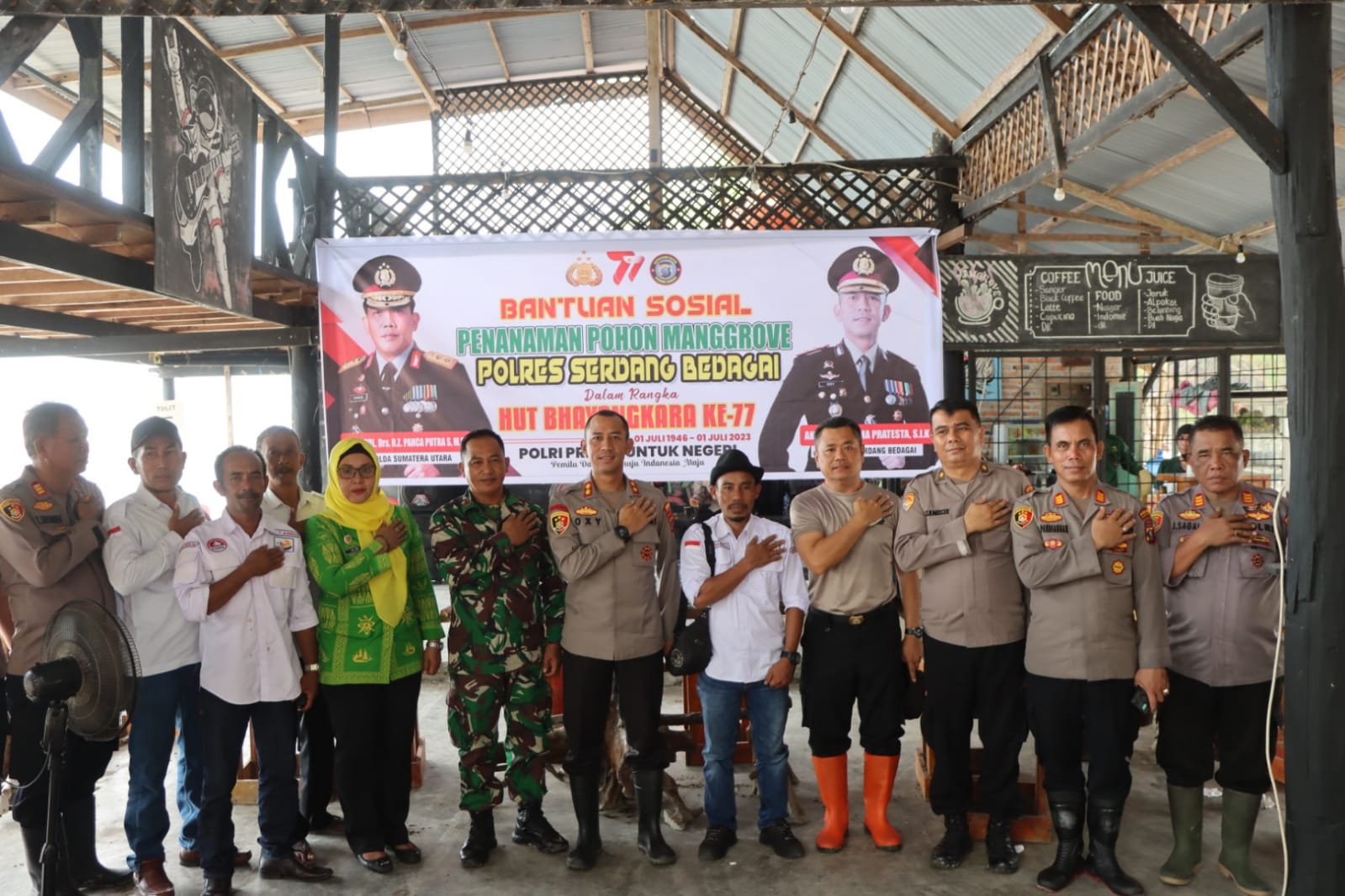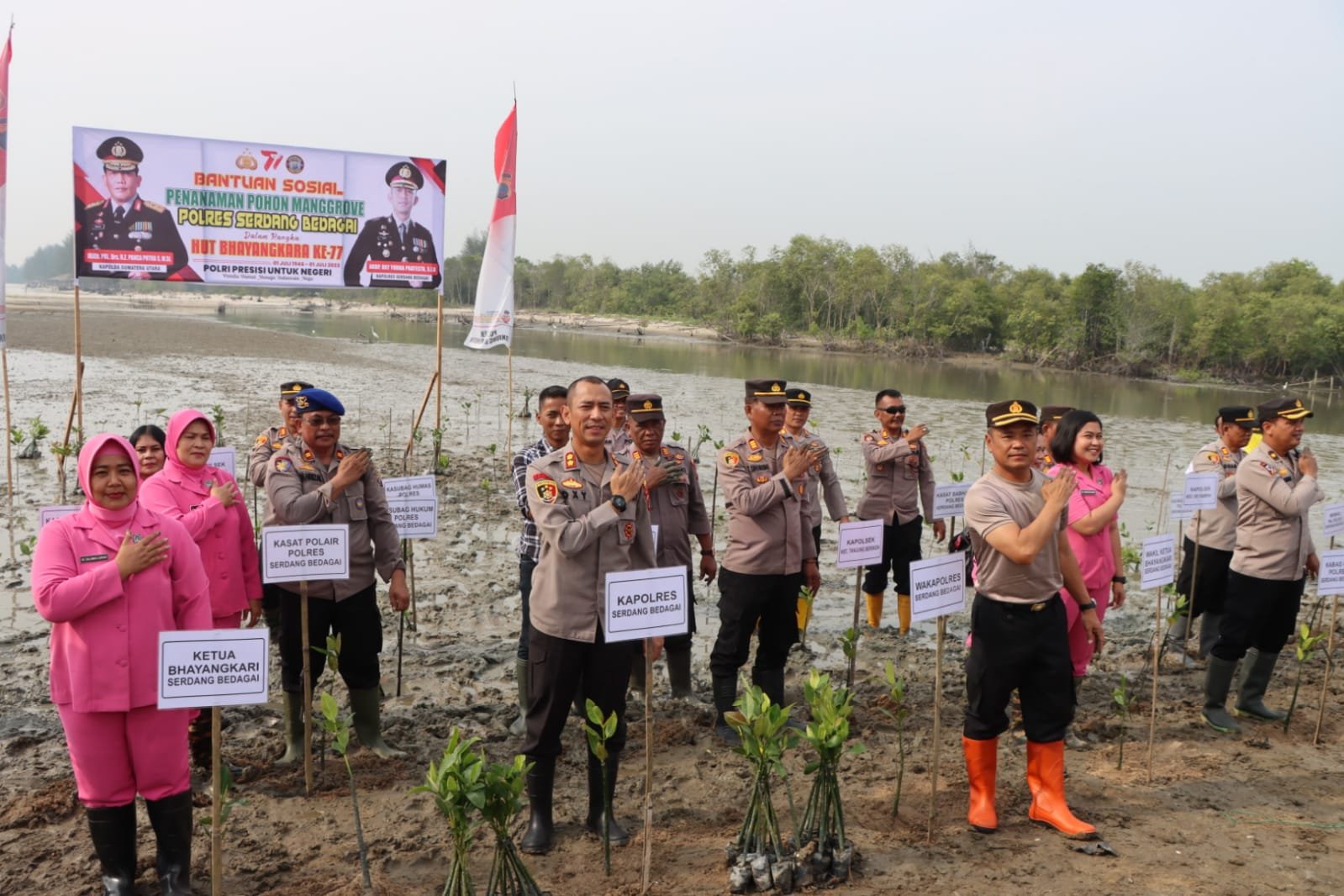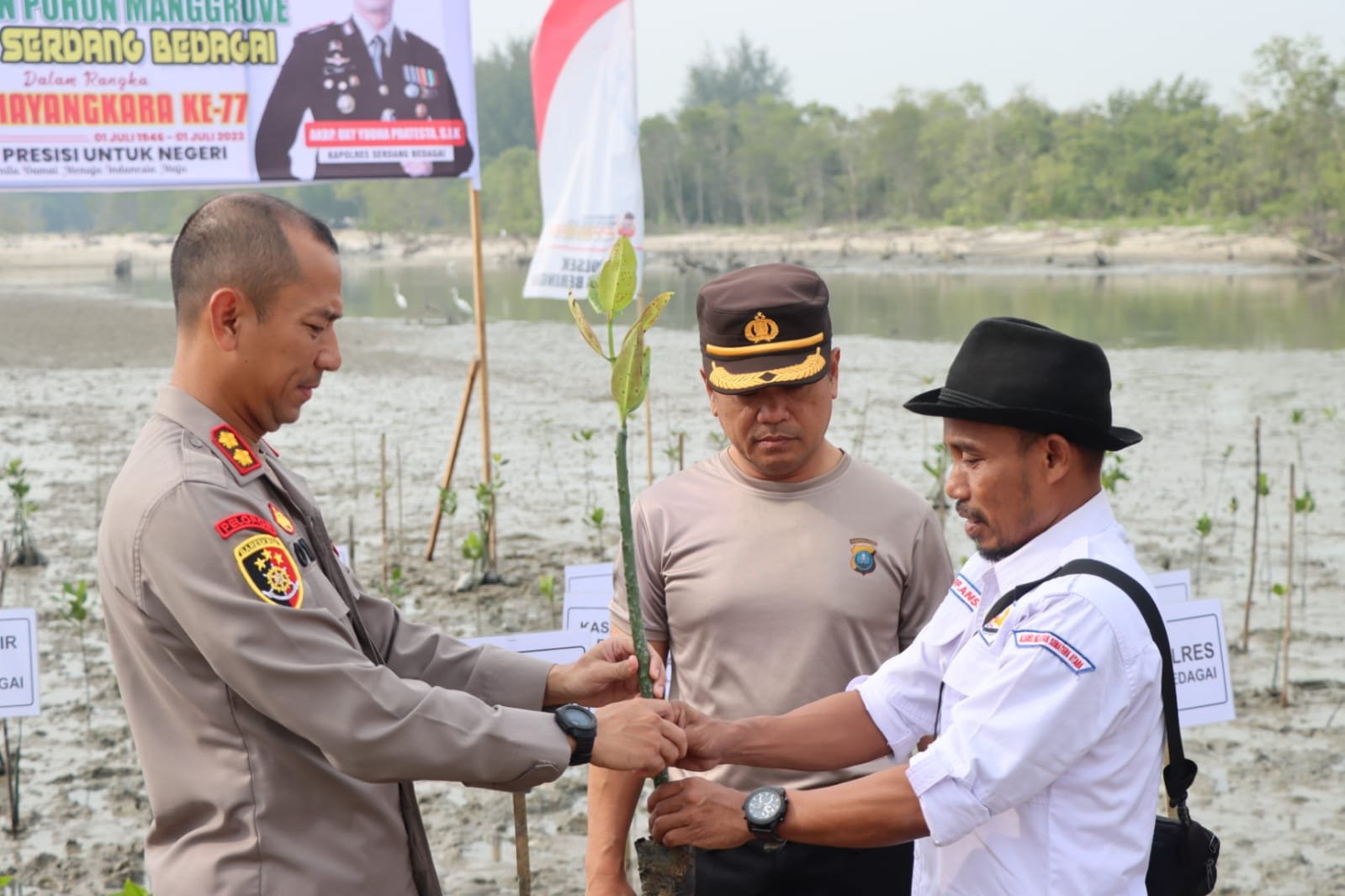 Bakti sosial penanaman bibit mangrove di jalur pantai (Hutan mangrove) Dusun III Desa Naga Lawan Kecamatan Perbaungan Kab. Serdang Bedagai oleh Kepolisian Polres Serdang Bedagai dengan melakukan penanam bibit (pohon) mangrove, Jumat 23 Juni 2023 Pukul 09.30 Wib.