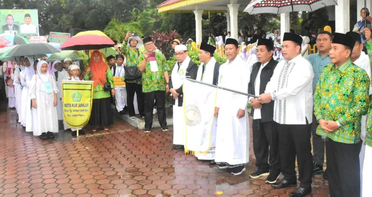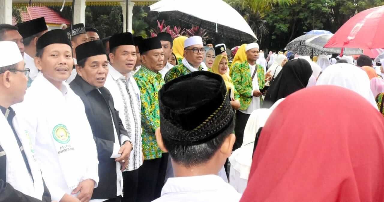 Sekretaris Daerah (Sekda) Kabupaten Deli Serdang, H Timur Tumanggor SSos MAP melepas peserta Praktik Manasik Haji Akbar ke-11 Ikatan Guru Diniyah Takmiliyah (IGDT) Kabupaten Deli Serdang di Alun-Alun Pemerintah Kabupaten (Pemkab) Deli Serdang, Minggu pagi (19/11/2023).