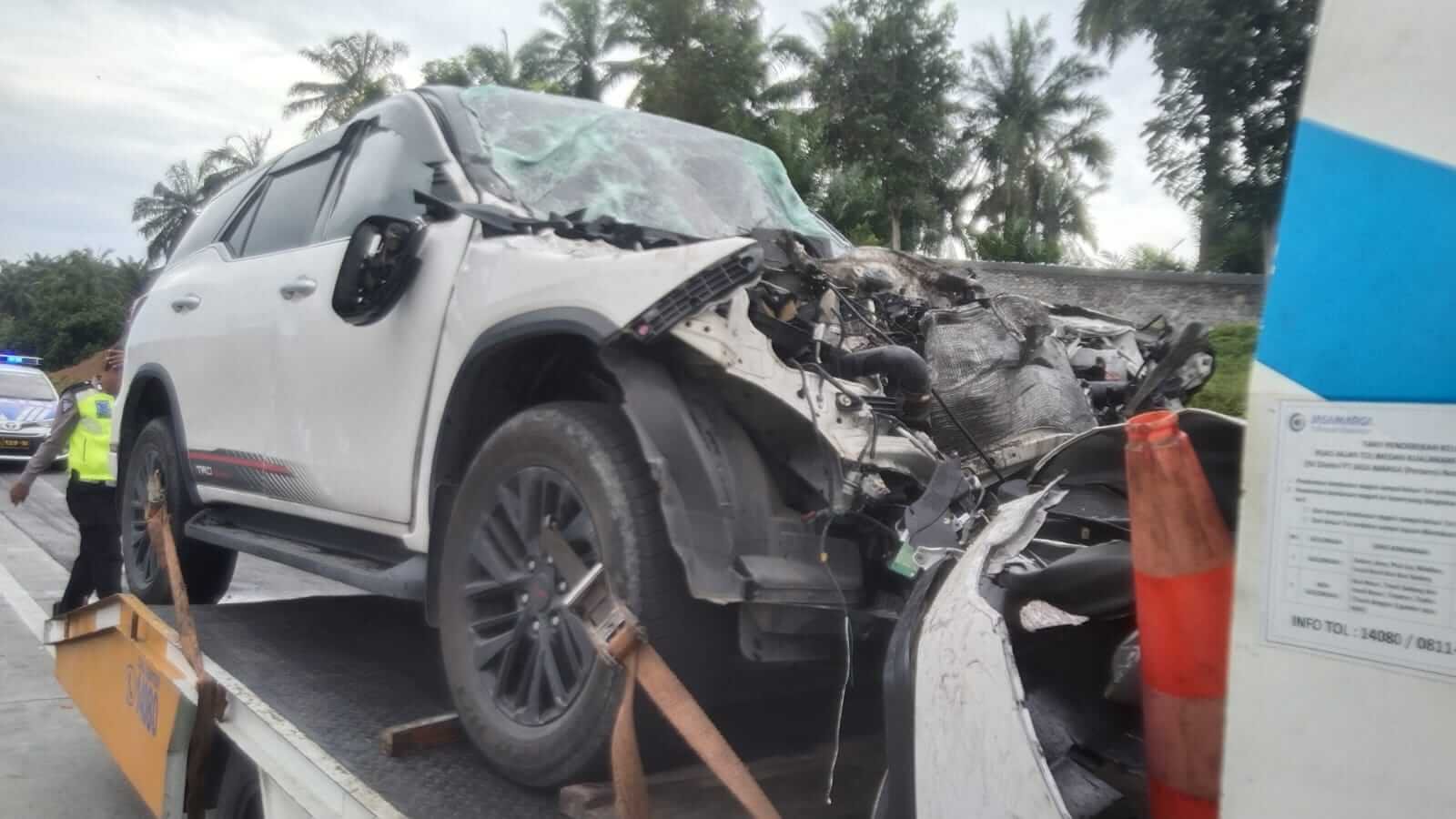 “Tidak ada korban jiwa dalam kecelakaan ini namun kondisi kap depan mobil Toyota Fortuner mengalami rusak parah.”