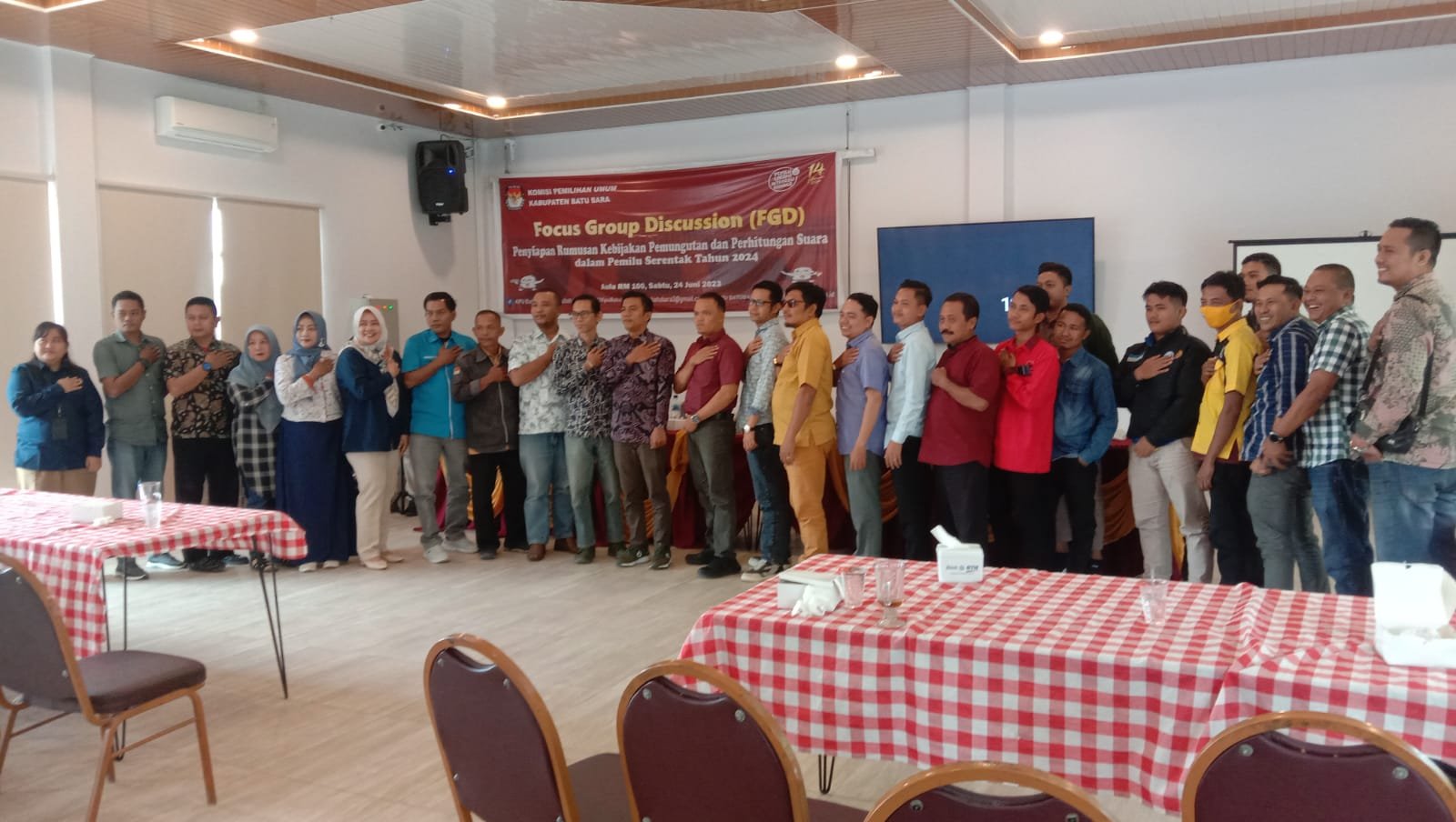 Dalam rangka mensukseskan pemilu tahun 2024 mendatang, Komisi Pemilihan Umum (KPU) Kabupaten Batu Bara melaksanakan Focus Group Discussion (FGD) di aula RM 100,Jln lintas Sumatera, Kecamatan Sei Suka, Kabupaten Batu Bara, Sabtu (24/06/2023).