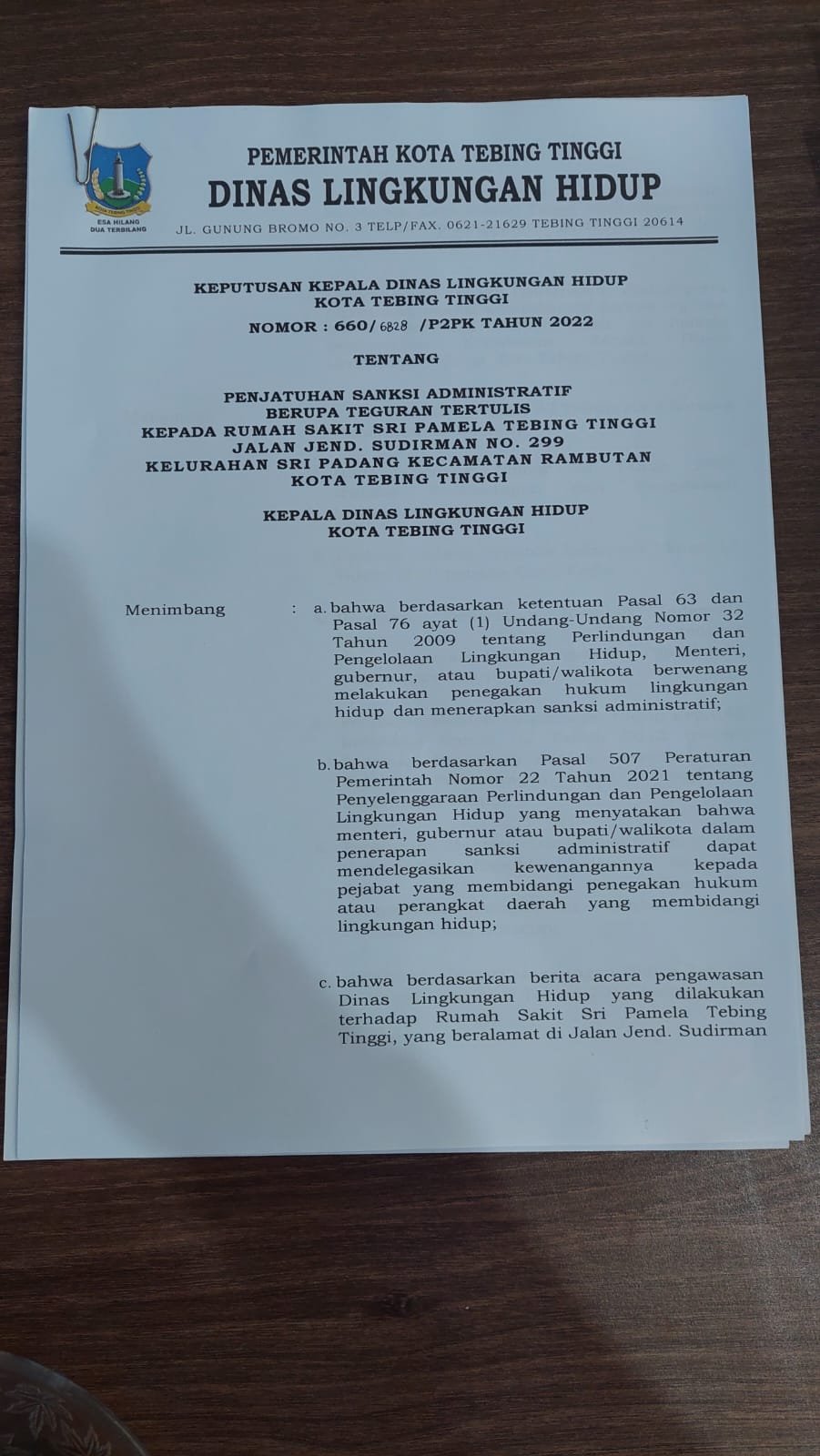 Pada hari Senin ,ini juga tanggal 12/12/2022 ,Pihaknya : telah, melayangkan Surat Sanksi Administratif dan teguran bernomor : 660/6628/P2PK Tahun 2022 ,kepada Pihak Managemen Rumah Sakit Sri Pamela Tebingtinggi (PT.SPMN) yang beralamat di Jalan Jendral Sudirman nomor 229 ,Kelurahan Sri Padang ,Kecamatan Rambutan Kota Tebing Tinggi Sumatera-Utara.