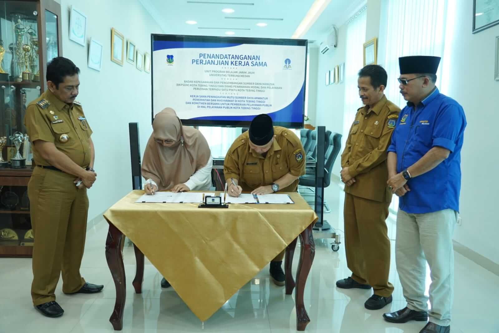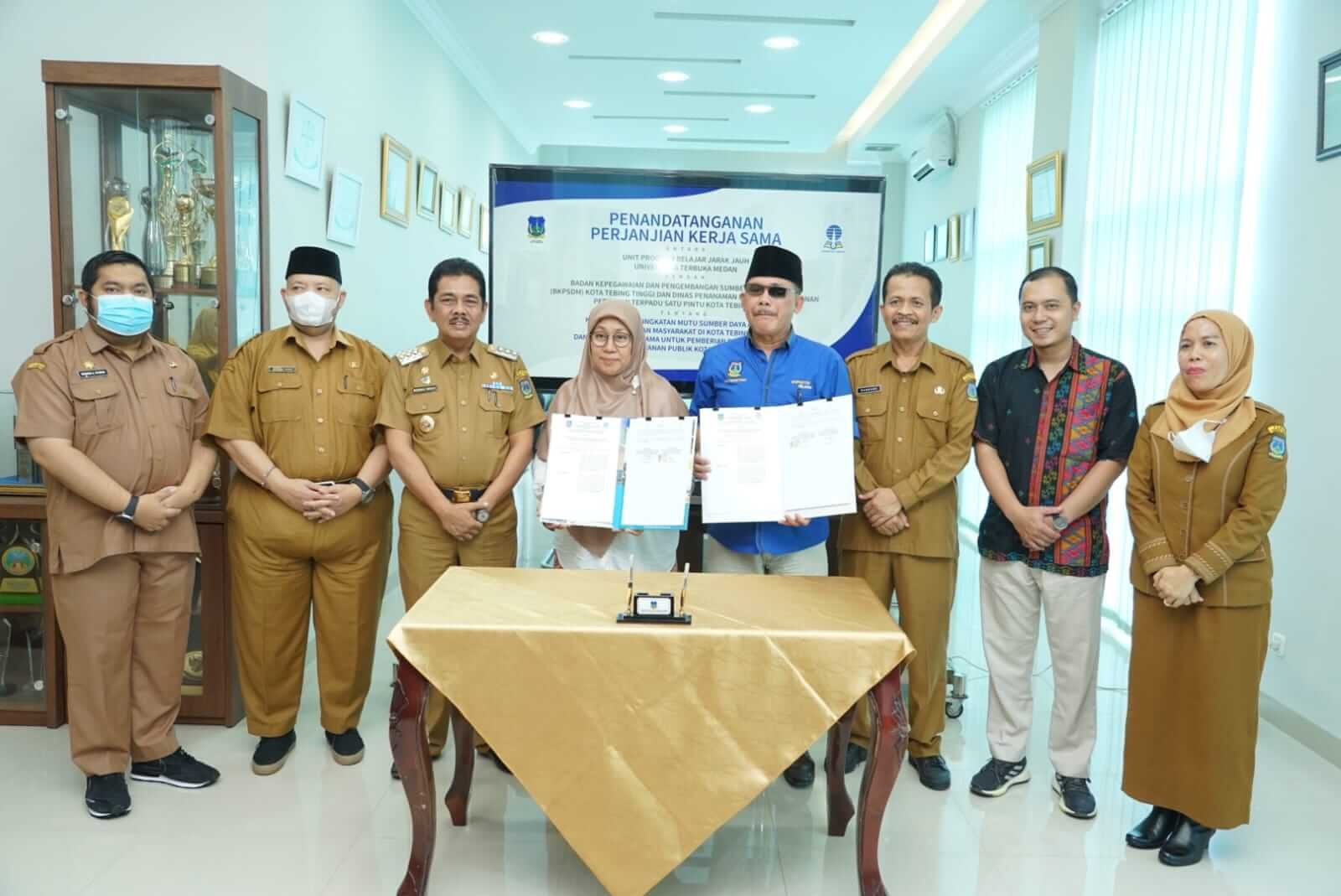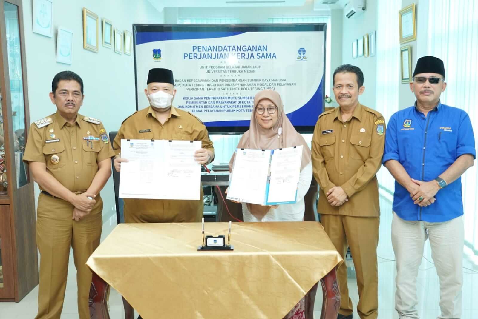 Menindaklanjuti Mou dengan Universitas terbuka yang telah dilakukan sebelumnya, Pemerintah Kota Tebing Tinggi melalui Badan Kepegawaian dan Pengembangan Sumberdaya Manusia (BKPSDM) dan Dinas Penanaman Modal dan Pelayanan Perizinan Terpadu Satu Pintu (DPMPTSP) Kota Tebing Tinggi melakukan penandatanganan kerjasama (PKS) dengan Universitas Terbuka (UT) Medan, Senin (10/10/2022) di Ruang Kerja Wali Kota Lantai 4 Balai Kota, Jalan Sutomo.