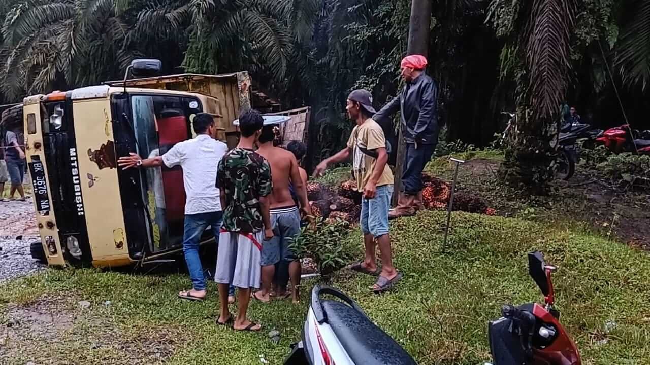 Barulah berkisar 3 jam lebih setelah terjadinya peristiwa,atas bantuan banyak warga yang melihat dan melintas di jalan tempat truk  Pengakut sawit  itu terguling ,akhirnya,truk BK 3676. NA  yang di kemudikan Minggu 55 tahun,dapat di selamatkan dan di tolong kembali untuk di berdirikan dan memuat sejumlah tbs sawit yang sempat berserakan akibat truk yang terguling di lokasi itu.