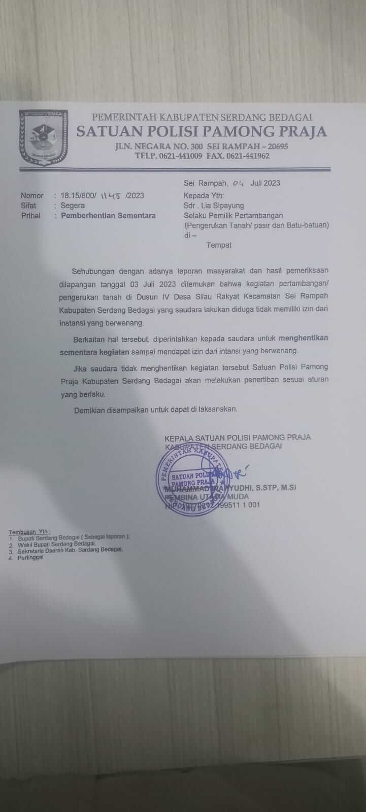 Surat pemberhentian sementara tertanggal ( 03/07) dari Kepolisian Pamong Praja Serdang Bedagai dengan No surat : 18.15/800/1145/2023 kepada sdi. Lia Sipayung selaku pemilik pertambangan ( pengeruk tanah ,pasir dan bebatuan yang di tanda tangani langsung Kepala kesatuan pamong Praja Serdang Bedagai Muhammad Wahyudi S.STP.MSI.